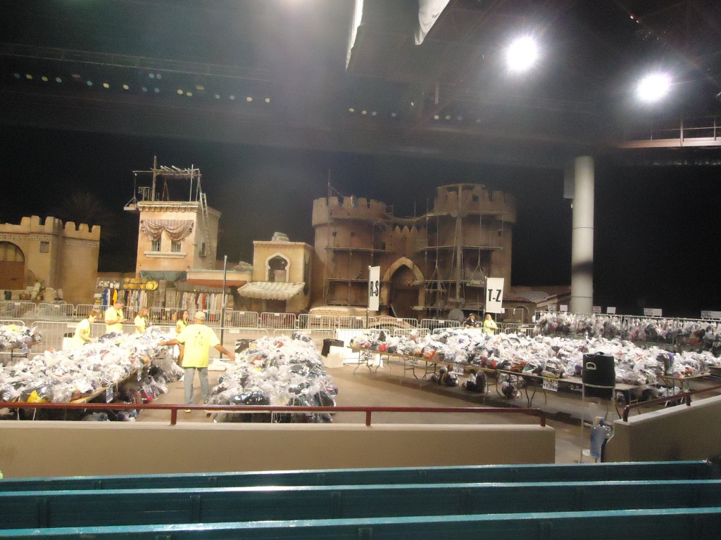 Prior to the event we were required to pick up credentials, these told us where to park the night of the race and which bus to board to make our way to the course. Once again a process I never thought about as a runner. Don’t the volunteers just magically appear? This is Disney after all. There is a precisely scheduled plan to get all of the volunteers to the course. We parked at the Magic Kingdom per our directions, checked-in, chose our snacks and sent to our bus. Once we arrived at Disney’s Hollywood Studios we quickly made our way to our designated job for the night. We were assigned to gEAR Check located at Indiana Jones Epic Stunt Spectacular. The amount of bags was unreal! Our team leader Bob, a Run Disney Cast Member walked us by the big boulder and airplane they use in the stunt show.