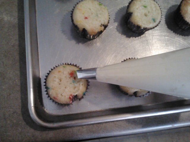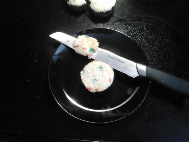 Once cooked and completely cooled, using a serrated knife, cut the tops off your cupcakes. You’ll want a flat surface to work with, so only do this if your cupcake baked higher than the liner.