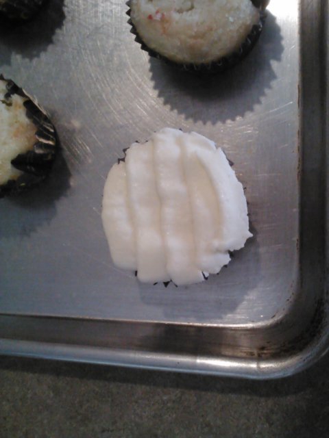 Using a petal frosting tip, (a tip with a flat end) pipe straight lines across your cupcake to achieve a wrapped mummy look.