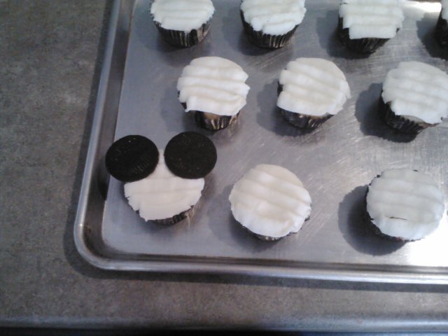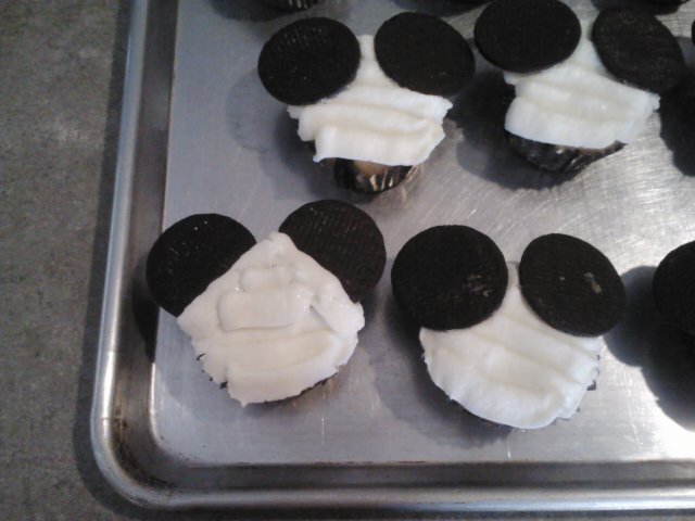 Split each chocolate cream cookie and scrape filling out carefully. Place the cookies on your cupcake to create ears.