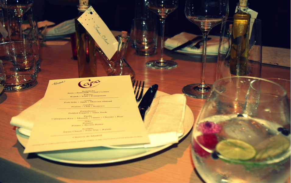 The evening’s menu and a refreshing Capa Gintonic, a signature cocktail, above