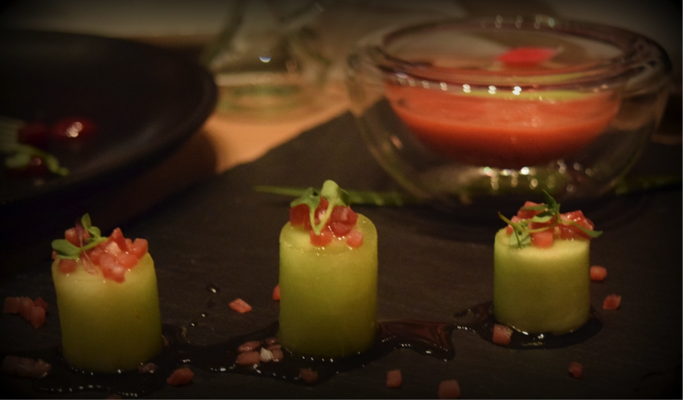 The first thing I noticed as I walked into the dining area of Capa was the massive red “cape” that appears to be billowing in a breeze on the ceiling of the restaurant. The kitchen is visible to the dining area, in the kitchen the chefs seemed focused on perfection and the result was incredible, as you will see below in the pictures. Every course was delicious and the attention to detail is evident even with my amateur photography.