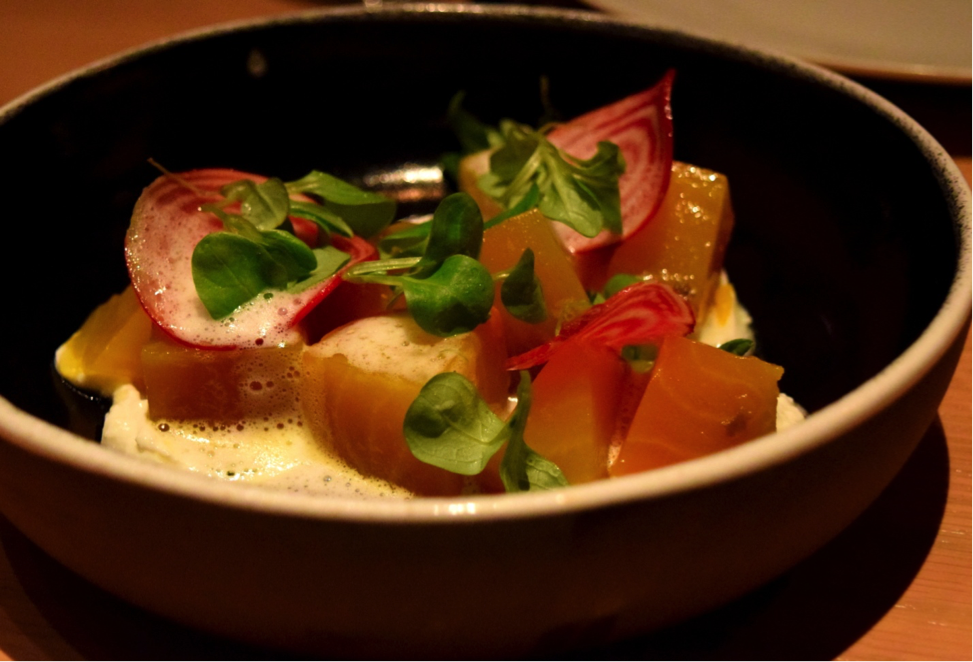 Below, delicious, slightly sweet Remolacha prepared with beets, buttermilk, lambs lettuce