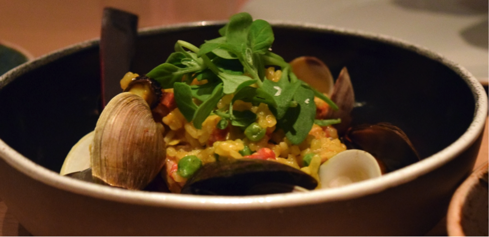 Below, Paella with Calasparra rice, mussels, clams, chorizo and peas