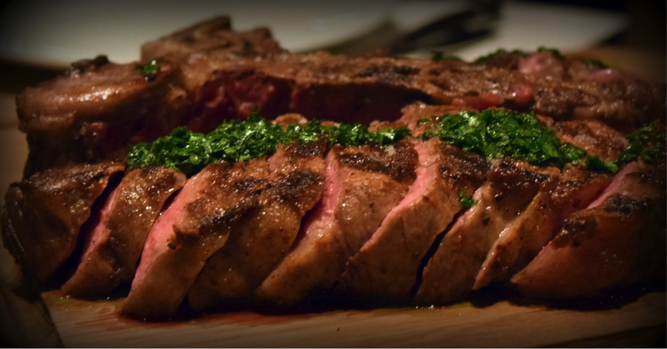 Below, Porterhouse with pickled peppers and salsa verde