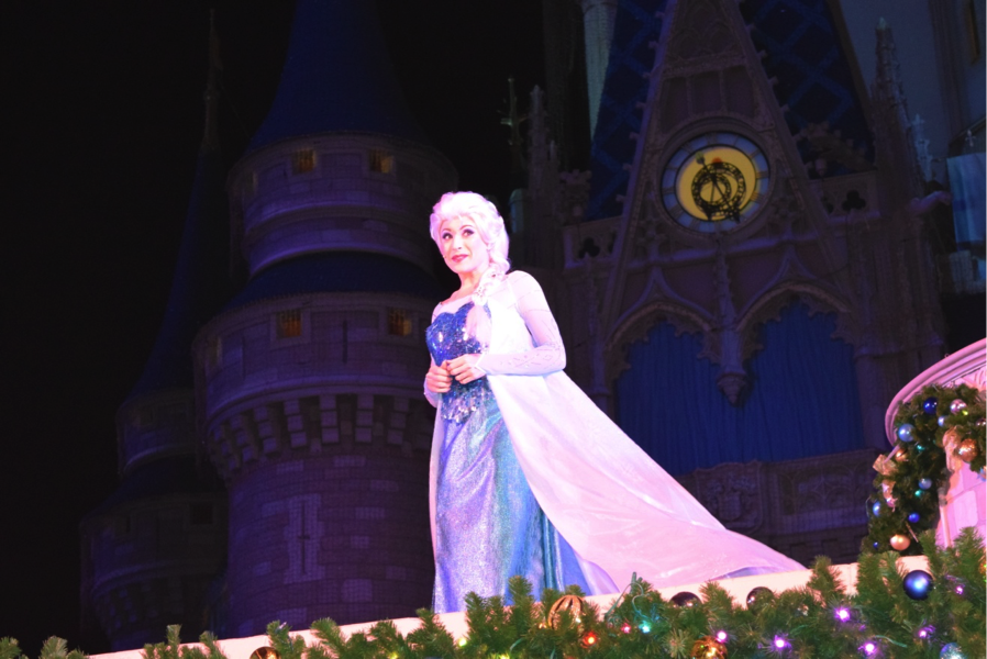 Olaf and Princess Ana charm Queen Elsa, persuading her to transform Cinderella’s castle, bringing winter to Magic Kingdom.