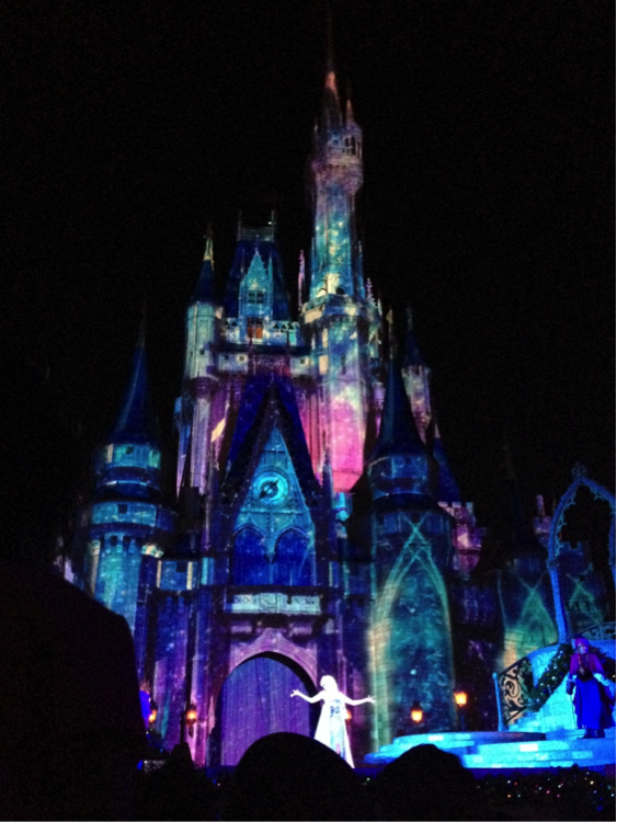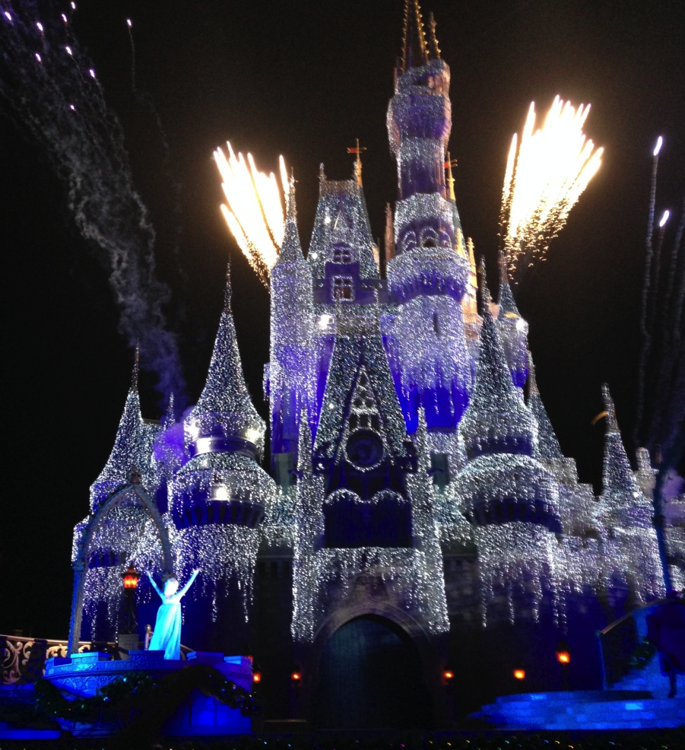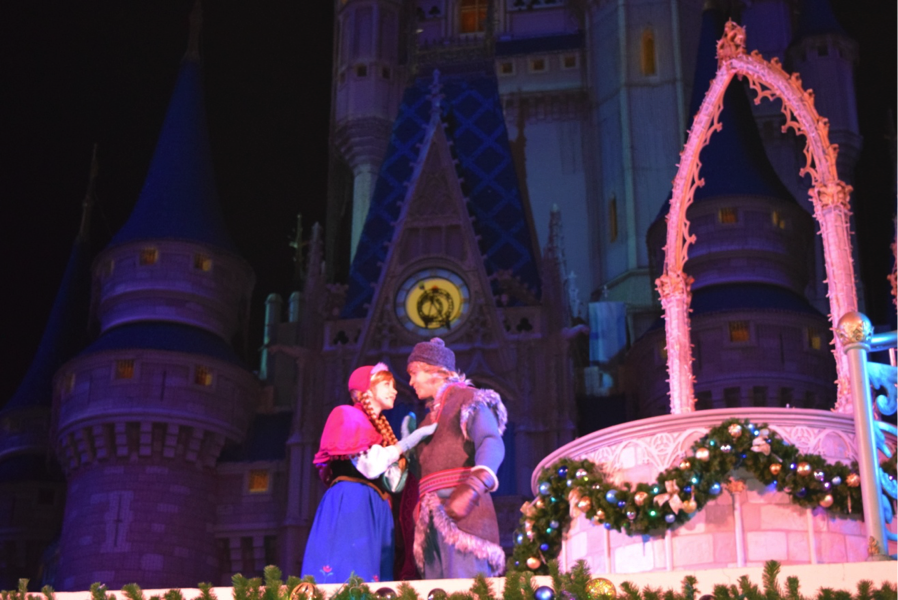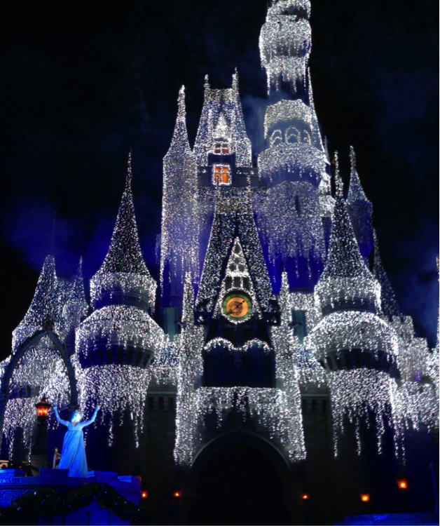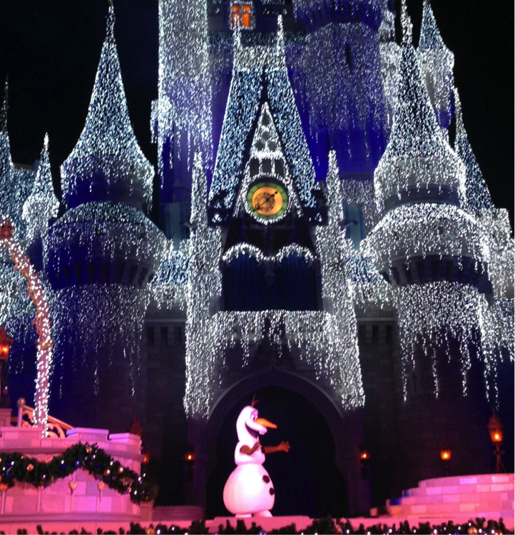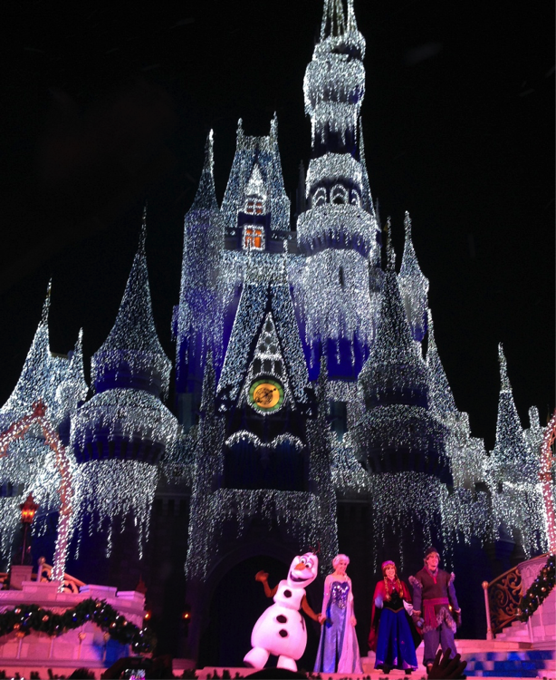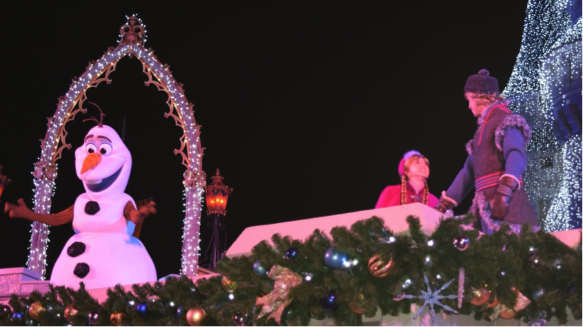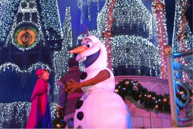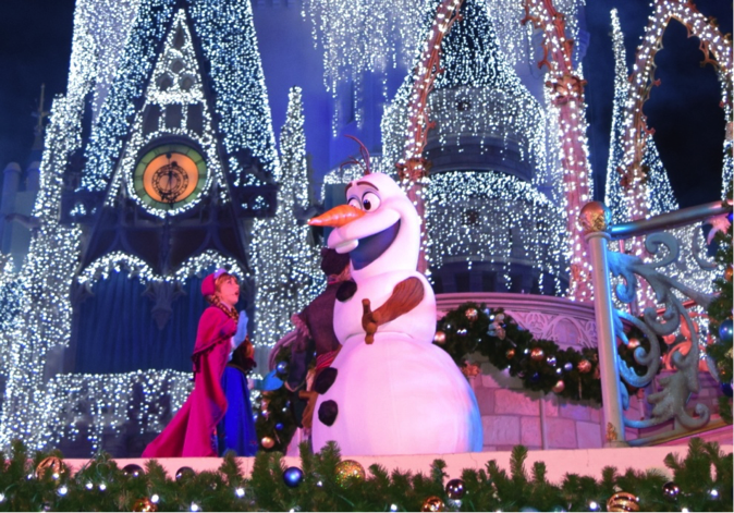 Frozen fans rejoice! Christmas has arrived at the Magic Kingdom with Olaf and the Frozen gang appearing nightly at the Magic Kingdom’s brand new castle lighting show, A Frozen Holiday Wish. Frozen characters Princess Ana, Queen Elsa, Kristoff and Olaf are visiting Walt Disney World but they have noticed that something is missing –the ice, snow and freezing cold weather are nowhere in sight. With the help of the audience’s “snow and ice!” chant, Queen Elsa is persuaded to work her magic, granting the audience’s wish and transforming Cinderella’s castle into a stunning icy palace with a finale that includes snow (soap?) falling over the audience. The Frozen anthem, “Let it Go”, is not part of this show although there are a few notes of it mingled into the background of the Christmas music.