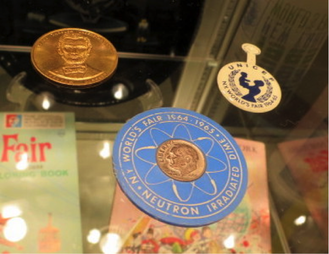 One of Becky’s favorite items displayed in this particular exhibit is the “Irradiated Dime” from the Hall of Science at the 1964-65 New York World’s Fair. She explained that you could put your own dime into a slot and it would then be dropped though a nifty machine which would shoot it with the “irradiator”. The dime would change color and fall into a slot where there was a Geiger counter that actually would prove to you that your dime was now radioactive! Fortunately, Becky said that the half-life of radiation for a dime is only about 22 seconds so it was likely safe by the time it was placed into a sleeve and then handed to you to take home.