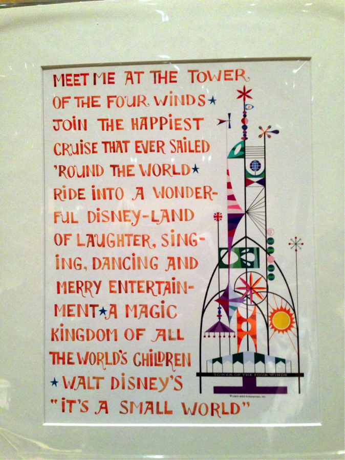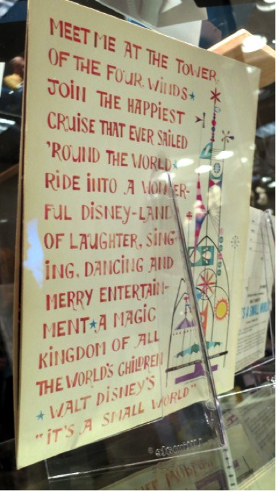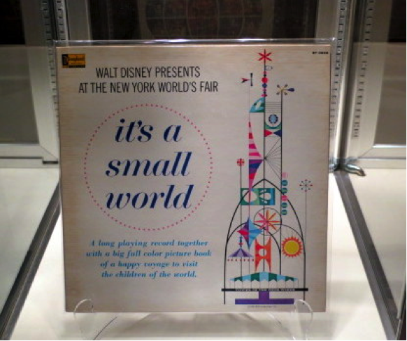 Below is a “long playing record together with a big full color picture book of a happy voyage to visit the children of the world” with a picture of the “Tower of the Four Winds” displayed on the front. This artwork is iconic, it is featured throughout the exhibit. The back of the record is available for purchase in a matted ready-to-frame picture in the Mickey’s of Glendale Giftshop.