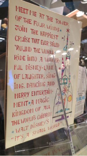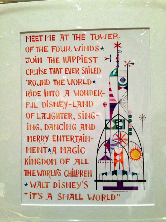 Above, a picture of a picture (ha! we do whatever we have to do to bring you all the details!) of a smiling Walt Disney with the concept for it’s a small world.
