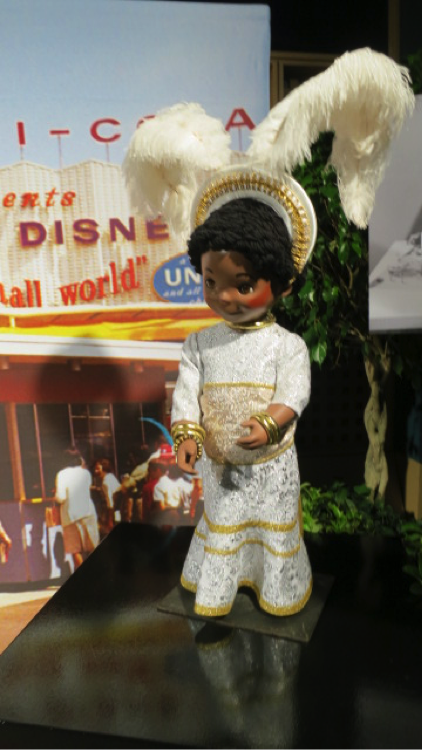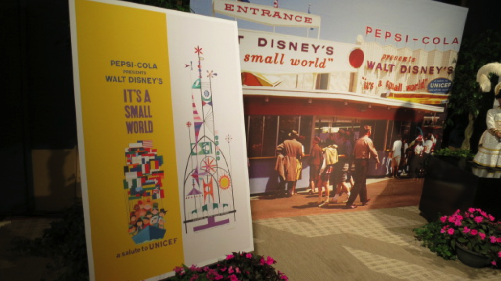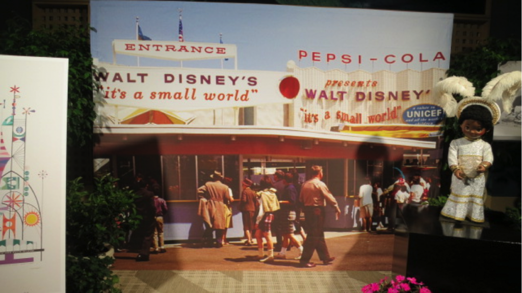 Below, a stand alone exhibit of the it’s a small world attraction had a large picture of the entrance, a costumed child and poster art.