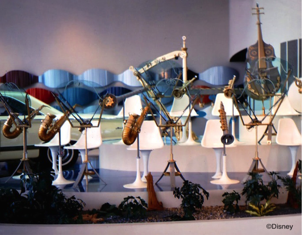 The Magic Skyway was located in the Ford Pavilion and used actual convertible Ford cars (the newly released Mustangs and also classic Lincolns) on a track that was designed by Bob Gurr to transport families through time. The journey included the early age of man, showing how man is bettering his way of life creating fire, weapons and a wheel, etc. Bob Gurr described how the tail lights were replaced nightly on the cars because they smashed into each other during the unload area due to “cheap” components that Ford used when they built the track, as opposed to the higher end and more sturdy concept track built at Disneyland prior to coming to the World’s Fair.The Ford Pavilion showcased a fabulous orchestra of musical instruments that was created using automobile parts including a differential, mufflers, tail pipes, hydraulic lines and windshield wipers! This was presented and discussed by historian Stacia Martin during her musical journey through pavilions at the fair. The music sounded great, actually. Slightly “tinny” but still, pleasing. The orchestra is pictured below.