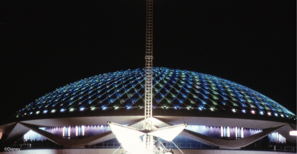 Below, the illuminated “Progressland” pavilion housing the Carousel of Progress