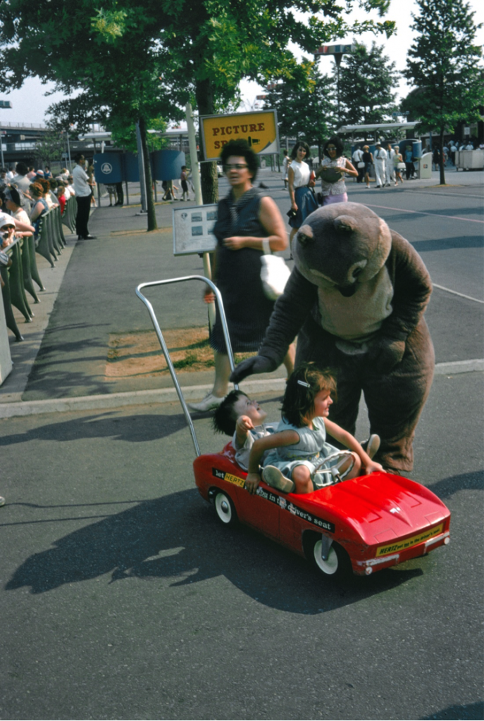 - During the fair, there were thousands of strollers (that were made to look like red cars) available for parents to rent at the fair. Today, only two have been located. Mr. Cotter provided a (copyrighted) photo for use in this article of a Disney Chipmunk entertaining a child in one of these now elusive Hertz strollers. Note, the crisp attire of the ladies and gentlemen in this scene. Quite a bit different from amusement park attendees in 2014, isn’t it? I feel inspired to wear pearls next time I visit Disney World.