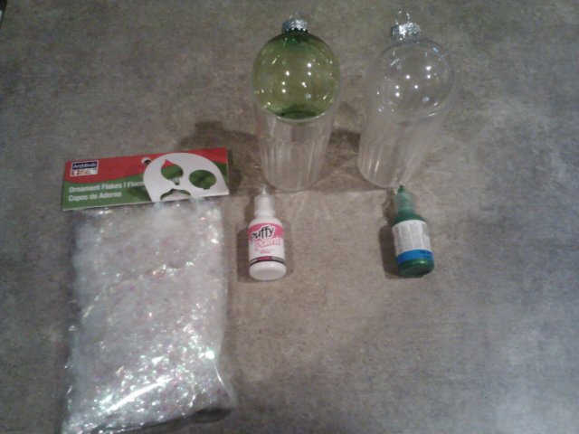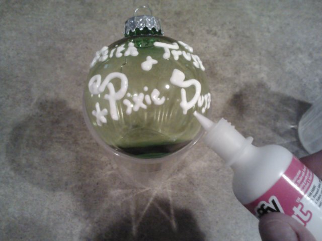 For starters, you need some ornaments. I chose clear ornaments, or tinted ornaments so I could personalize my colors. I started with a green tinted and clear ornament, some clear, shiny ornament filler and some puffy paint.