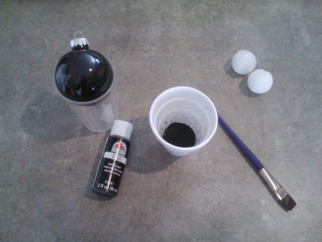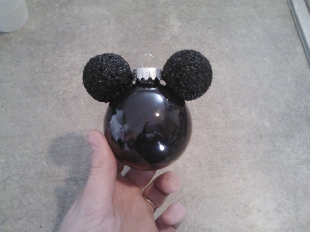 For my next and last, I decided to make the classic Mickey. I used a black ornament, two small styrofoam balls, black acrylic paint, and a glue gun.