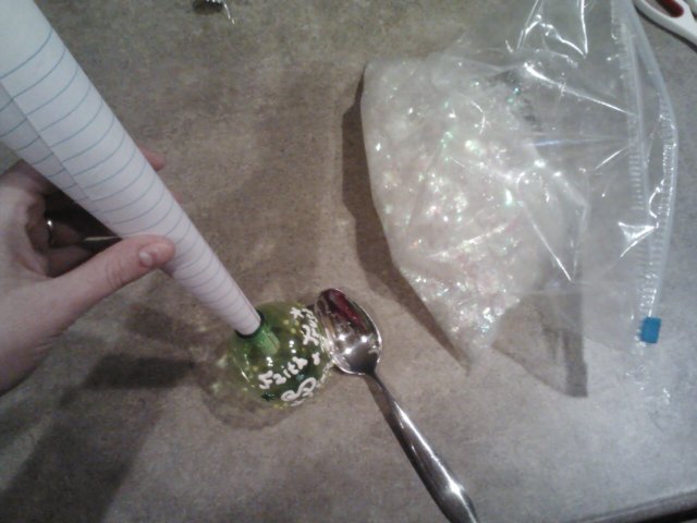 I like using ornament filler to add variation and some pixie dust sparkle to my ornaments. This, however, tends to get incredibly messy, especially if you're crafting with kids. The easiest way to add sequins, sparkles, or any other filler is to roll paper into a funnel and insert in the top of the ornament. Carefully remove the cap off the ornament and carefully spoon your filler until your reach your desired amount. For my pixie dust ornament, I chose to fill it only half way full so you could see the pixie dust better.