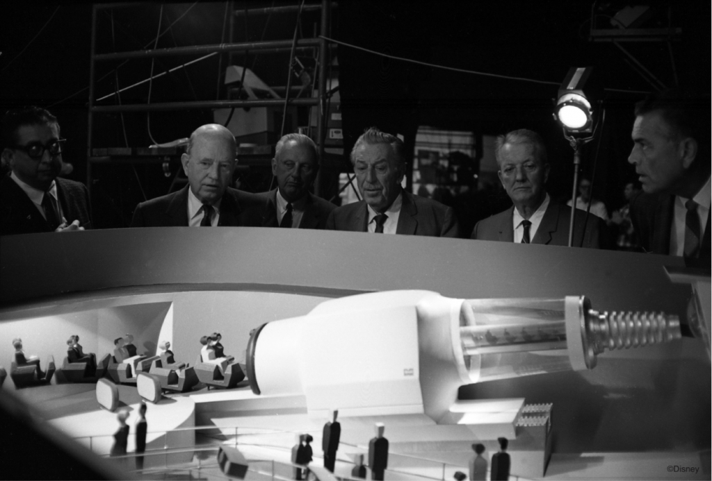 Walt Disney, his team of Imagineers, and representatives from Monsanto examine a model of the Mighty Microscope for Adventure Thru Inner Space, featured in Walt Disney Archives Director Becky Cline and historian Stacia Martin’s presentation “Disneyland: Fond Memories of the Past,” a journey through some of the park’s most beloved attractions of yesteryear. ©Disney