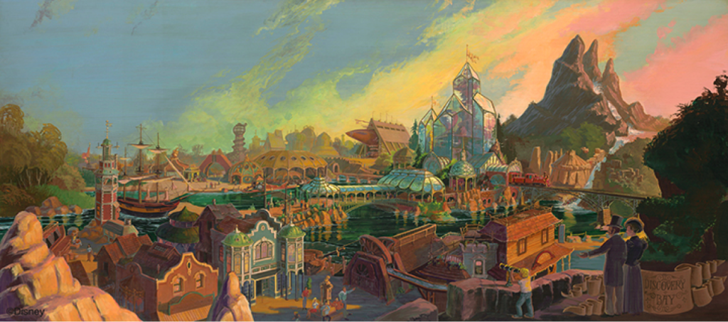 Concept art of Discovery Bay from the “Discovery Bay Chronicles,” a presentation in which Disney Legend Tony Baxter took guests on an in-depth tour of the never-built concept for Disneyland. ©Disney