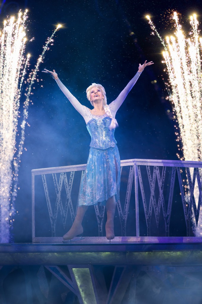Despite the limited number of set pieces and props available, the show's designers did a wonderful job creating Arendelle on ice. In fact, many iconic set pieces from the movie can be found in the show. Arendelle's town square fountain freezes and thaws before your eyes, Kristoff's sled is packed full of slow selling ice, and Elsa’s infamous ice steps make an appearance. In addition to props and set pieces, the use of theatrical lights and pyrotechnics are highly effective to create the perfect mood and environment. I don't want to give too much away, but different light filters and colors are used throughout the show to simulate sun, snow, and other ice wonders.