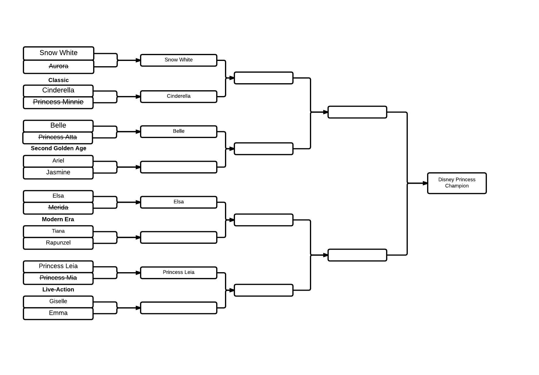 The LaughingPlace.com Selection Committee has revealed the bracket for the 2015 Mouse Madness tournament, whose theme this year is “Disney Princesses.” The committee seeded the selections into four regions; Classic, Second Golden Age, Modern Era, and live-action. The champion of each region will meet in the Fantasmic Four round, with the Mouse Madness Champion being crowned at the end of the tournament.