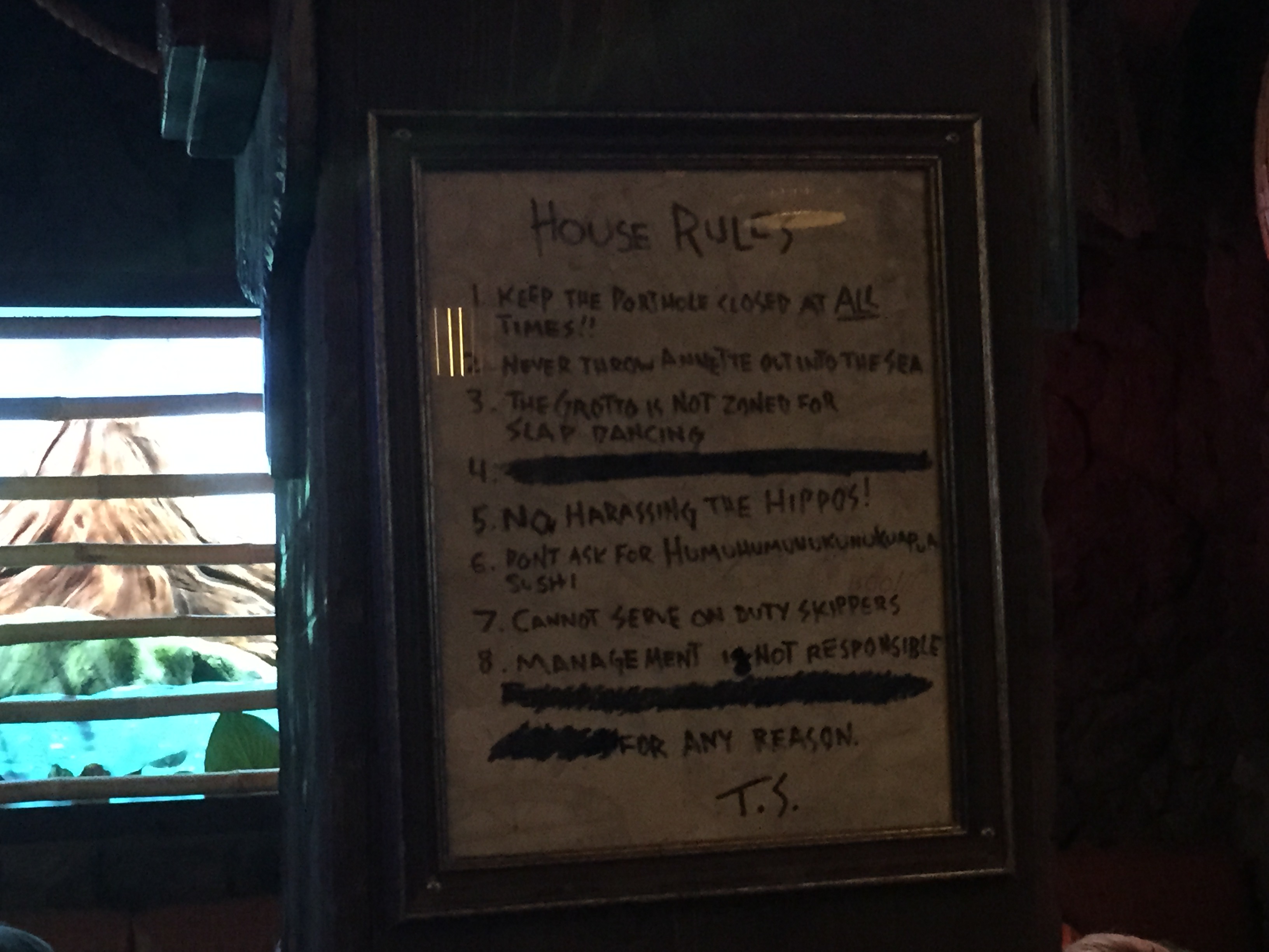 When the Nautilus is ordered a lot happens between the skippers and things behind the bar along with a great lighting effect and actual narration from the 20,000 Leagues Under the Sea attraction from the Magic Kingdom.