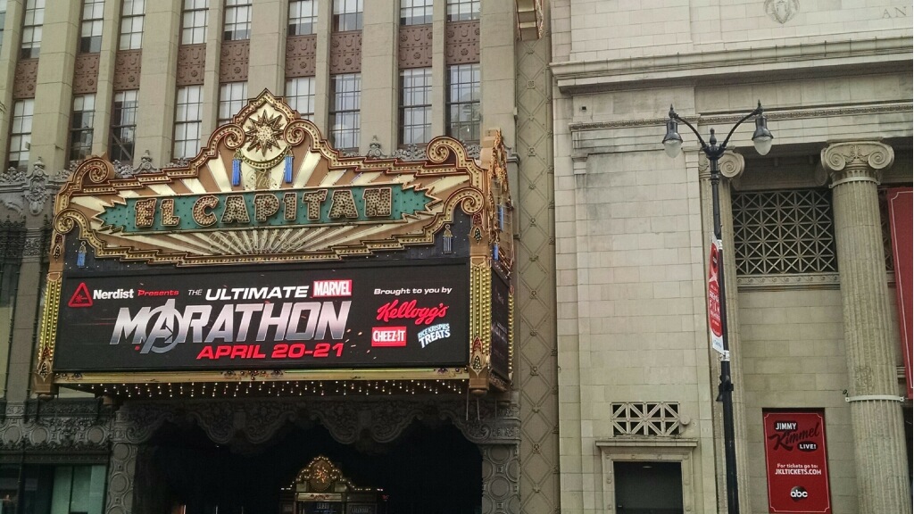 I will say as enjoyable as the movie was, the real thrill of this event was the adventure of the marathon itself. The idea of spending an entire day and a half of your life watching movies may seen extreme in some people's eyes, but there is something thrilling about accomplishing such a bold and unusual adventure not many would be able to pull off willingly or physically. And to share the accomplishment with a very enthusiastic crowd made the event as exciting and fun as anything I’ve ever done. As was pointed out by the manager of the El Capitan, this is an event one can tell to their grandchildren one day. It certainly was 2 nights and 1 day I can’t imagine ever forgetting and am wanting to enthusiastically share with as many as possible. I also can’t stress how excellent the El Capitan staff was in their patience and their willingness to give and make the guests’ night as hassle-free and enjoyable as possible. All in all, one can say this lifetime experience was quite Marvel-ous.