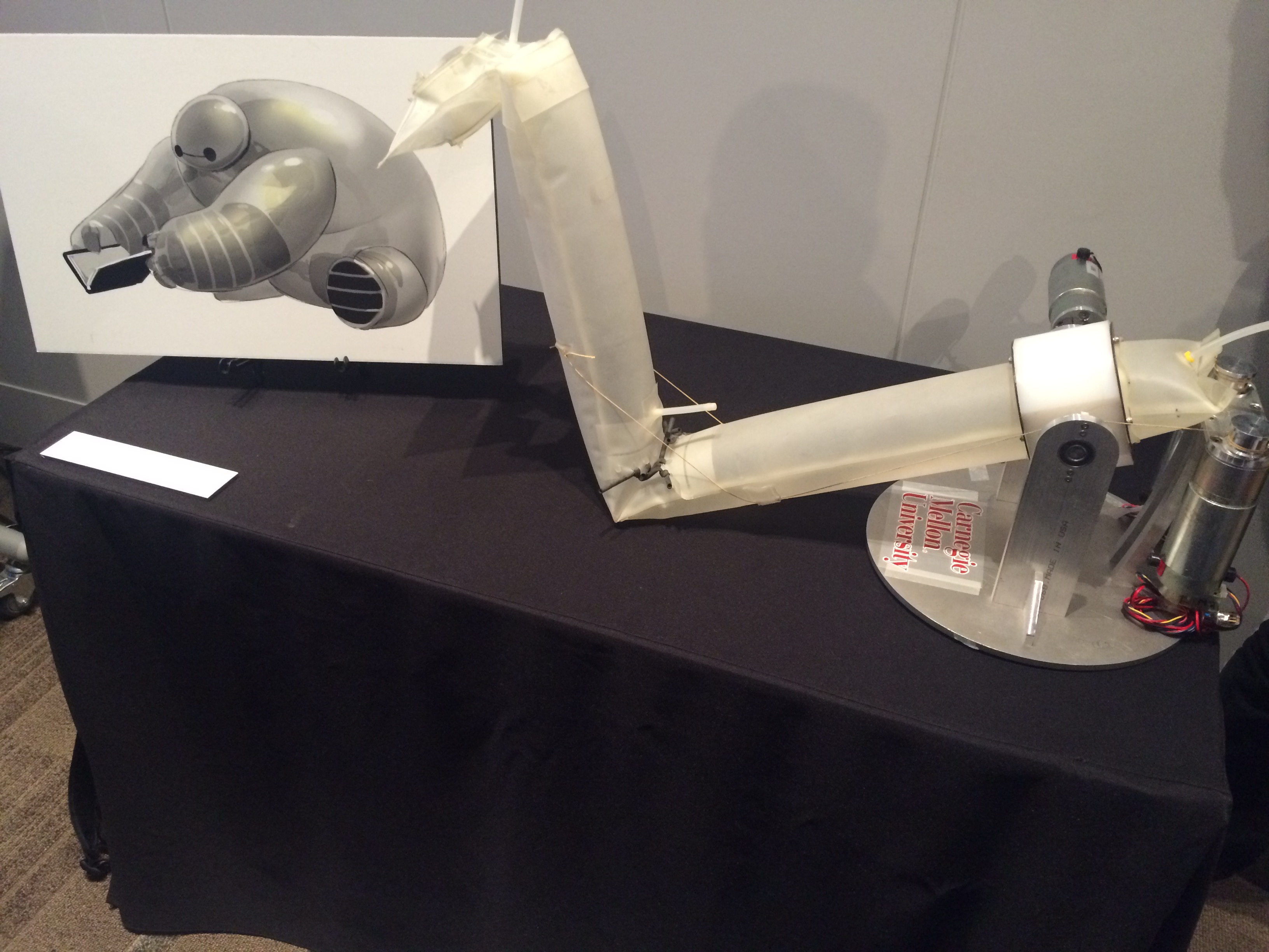 When it came time to create Baymax, they wanted a cuddly look. So with the help of a visit to Carnegie Mellon University, the inspiration for Baymax was found. The robotics department had created a vinyl-covered soft robotics arm, and Hall knew that he had the right look for Baymax right then and there. The arm was on display in the lobby after the panel, and it was great to see it.