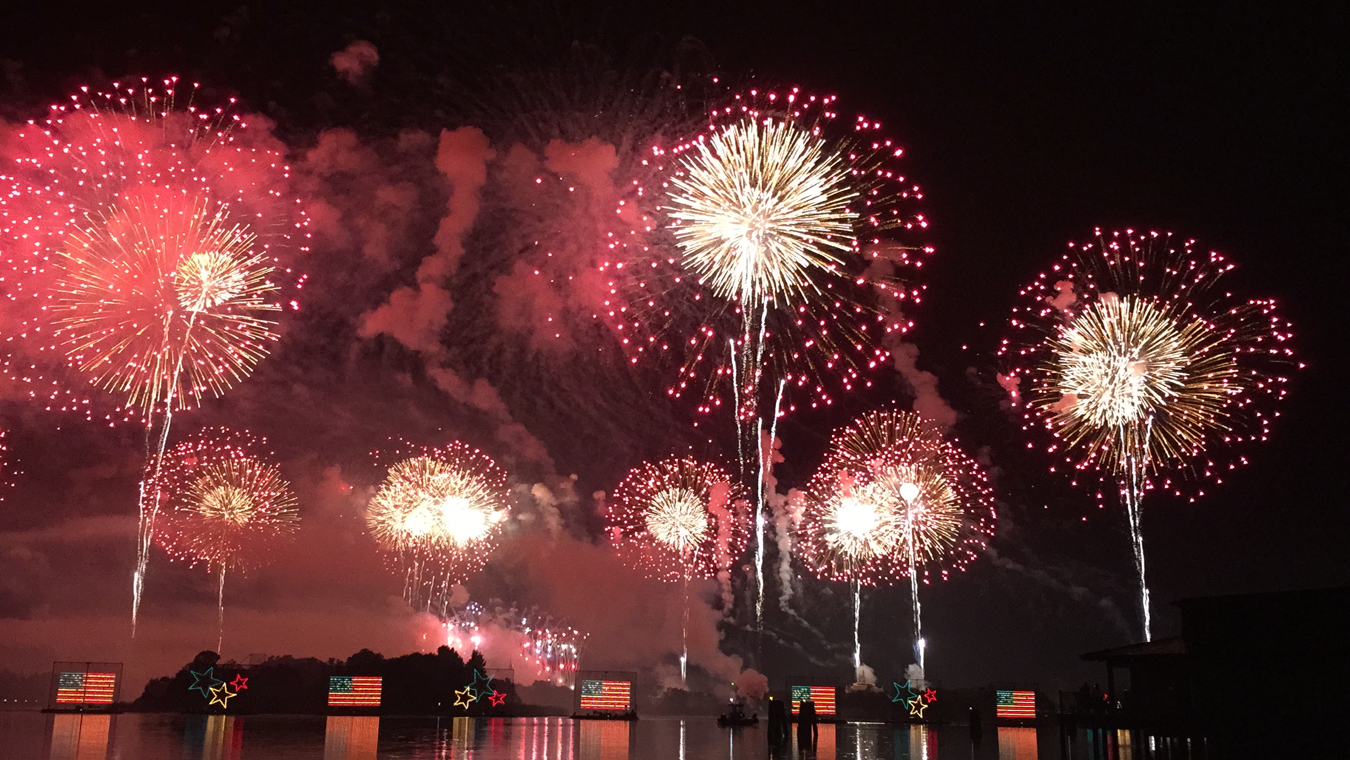 Of course, no Independence Day would be complete without some bombs bursting in air! Which takes us to the Polynesian Village Resort beach, my favorite place to watch any Magic Kingdom fireworks from, but even more so on the 4th of July with a "mirror launch" barge. The additional barge and use of the Electric Water Pageant floats was added years ago to try and help alleviate the sheer number of guests who flood into Magic Kingdom for the big fireworks show by adding extra viewing ability to guests along the Seven Seas Lagoon. Not only is it a spectacular show, it is also very touching as it goes through our history not just shooting shells in the air.