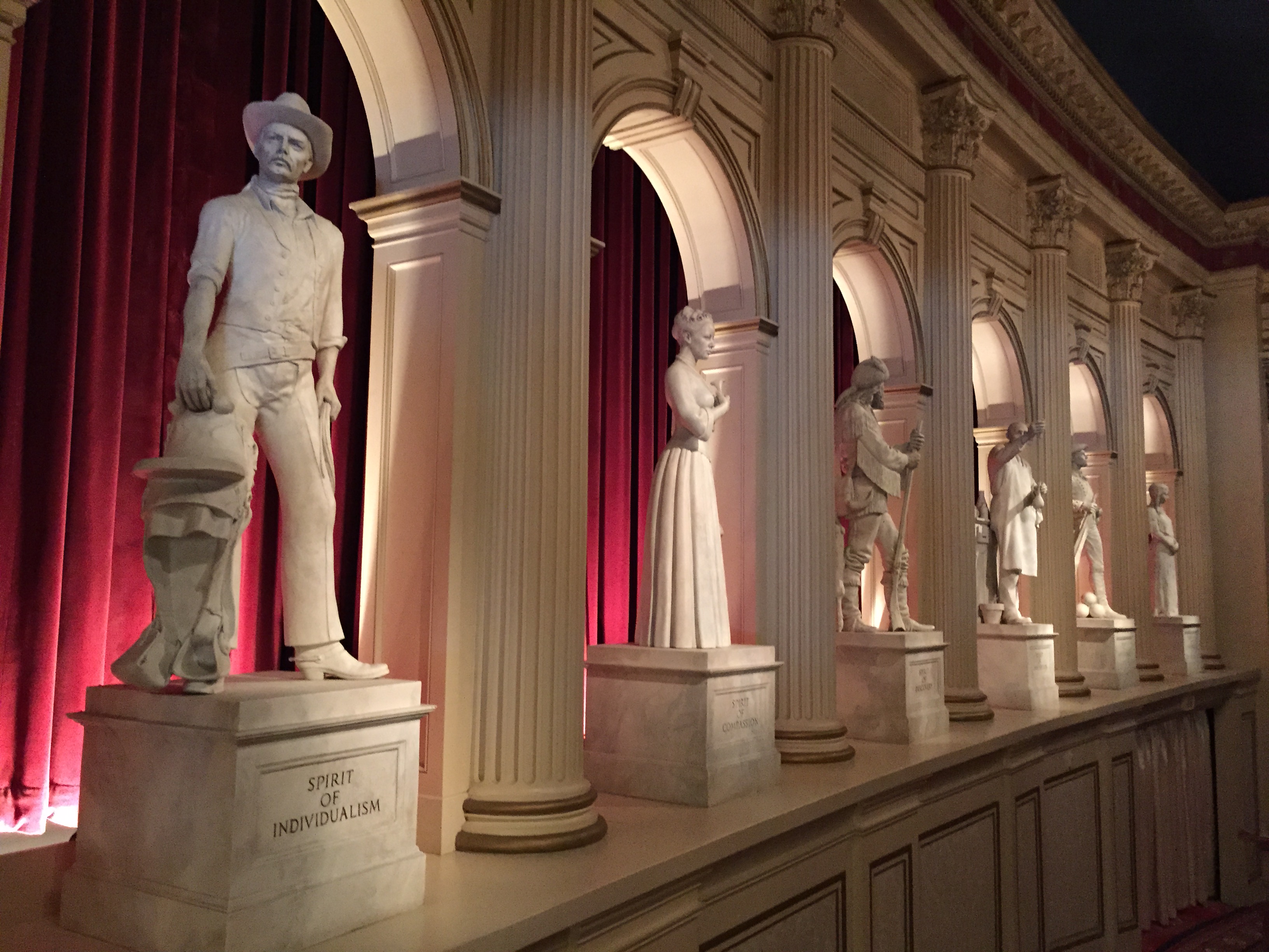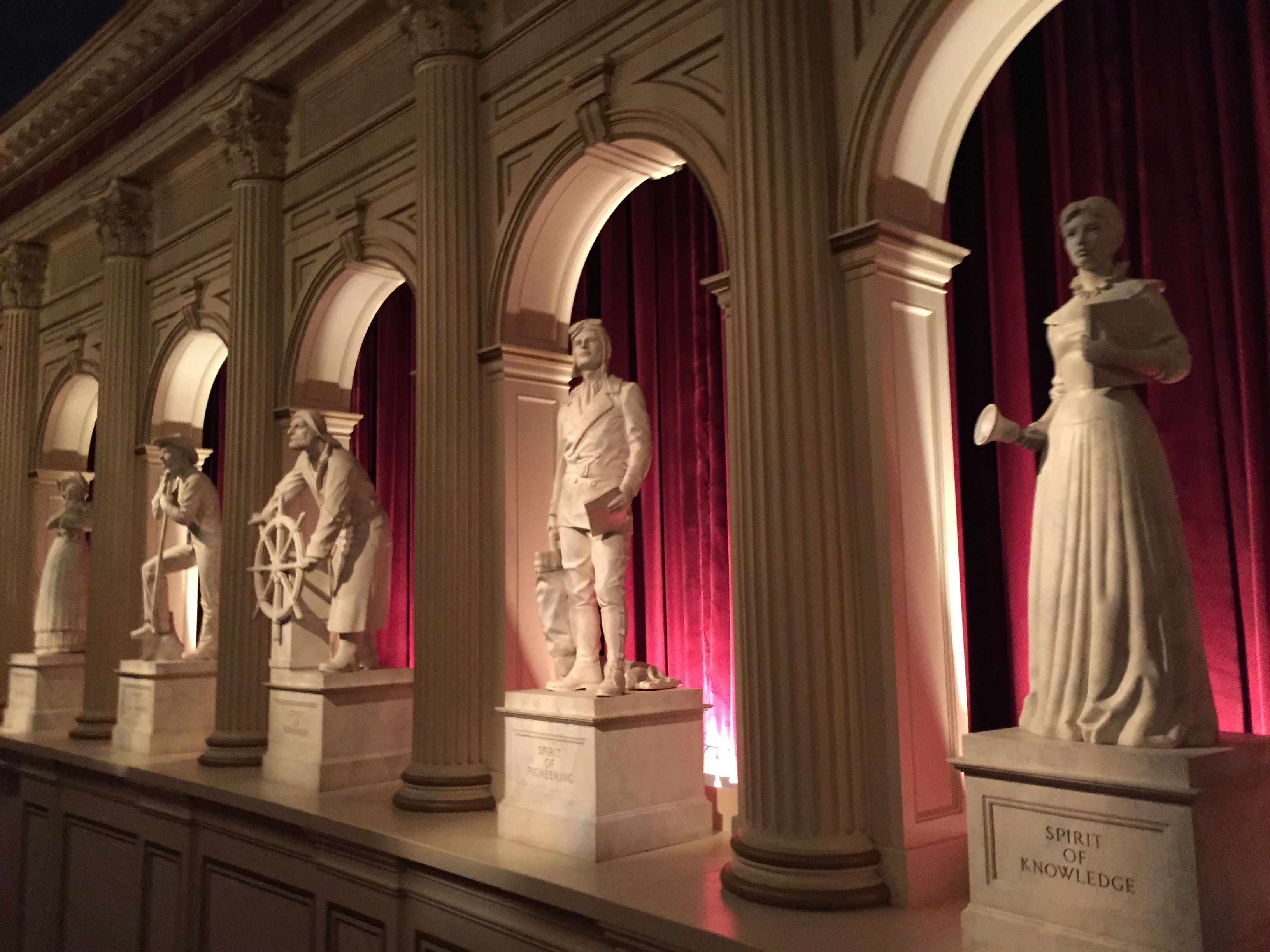 - Spirits of America (Epcot in Disneyland) - In the lobby of the Opera House are many displays ranging from the history of Disneyland to to a scale model of our Nations Capital building. But one of the unique things that tie Disneyland with Epcot is the maquettes of the full size "Spirits of America" statues that flank both sides of the stage of the American Adventure.