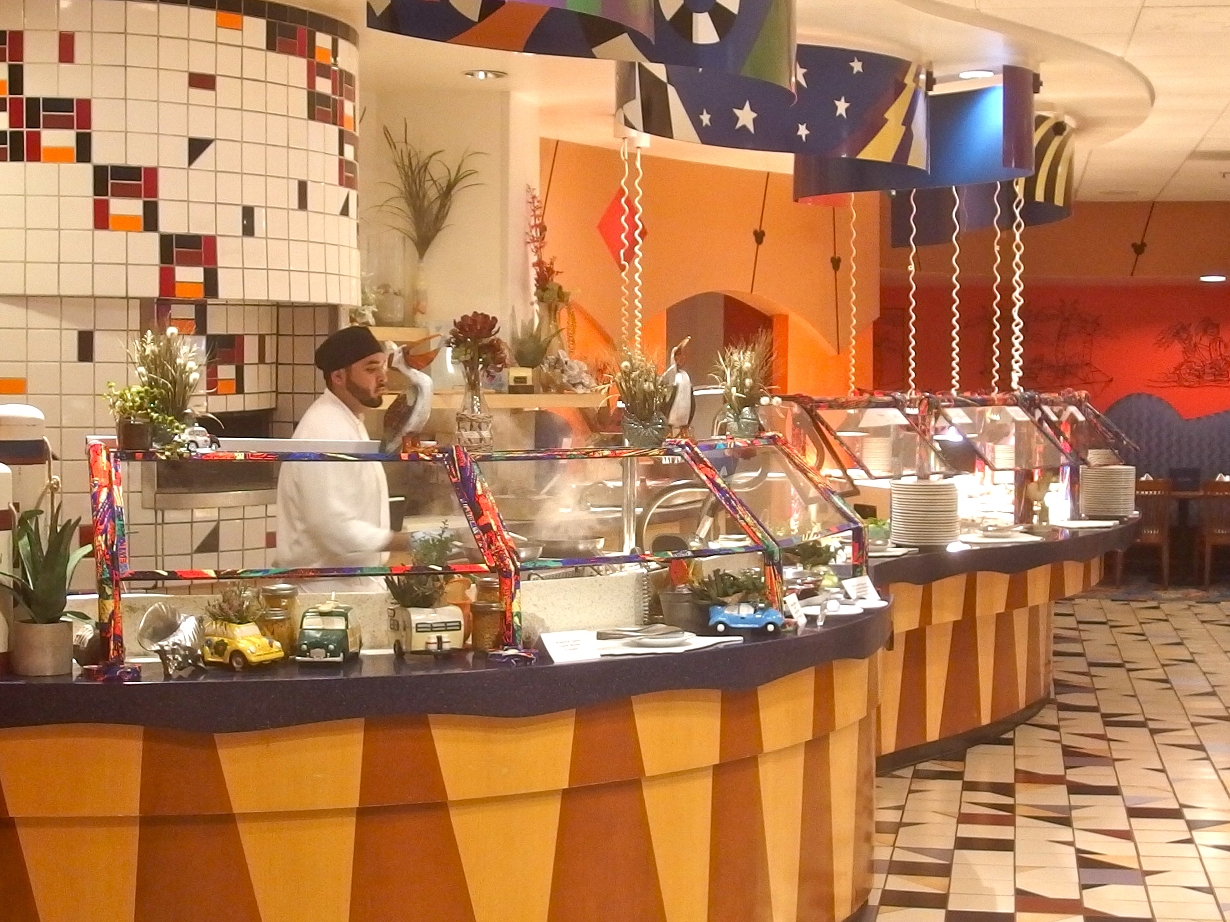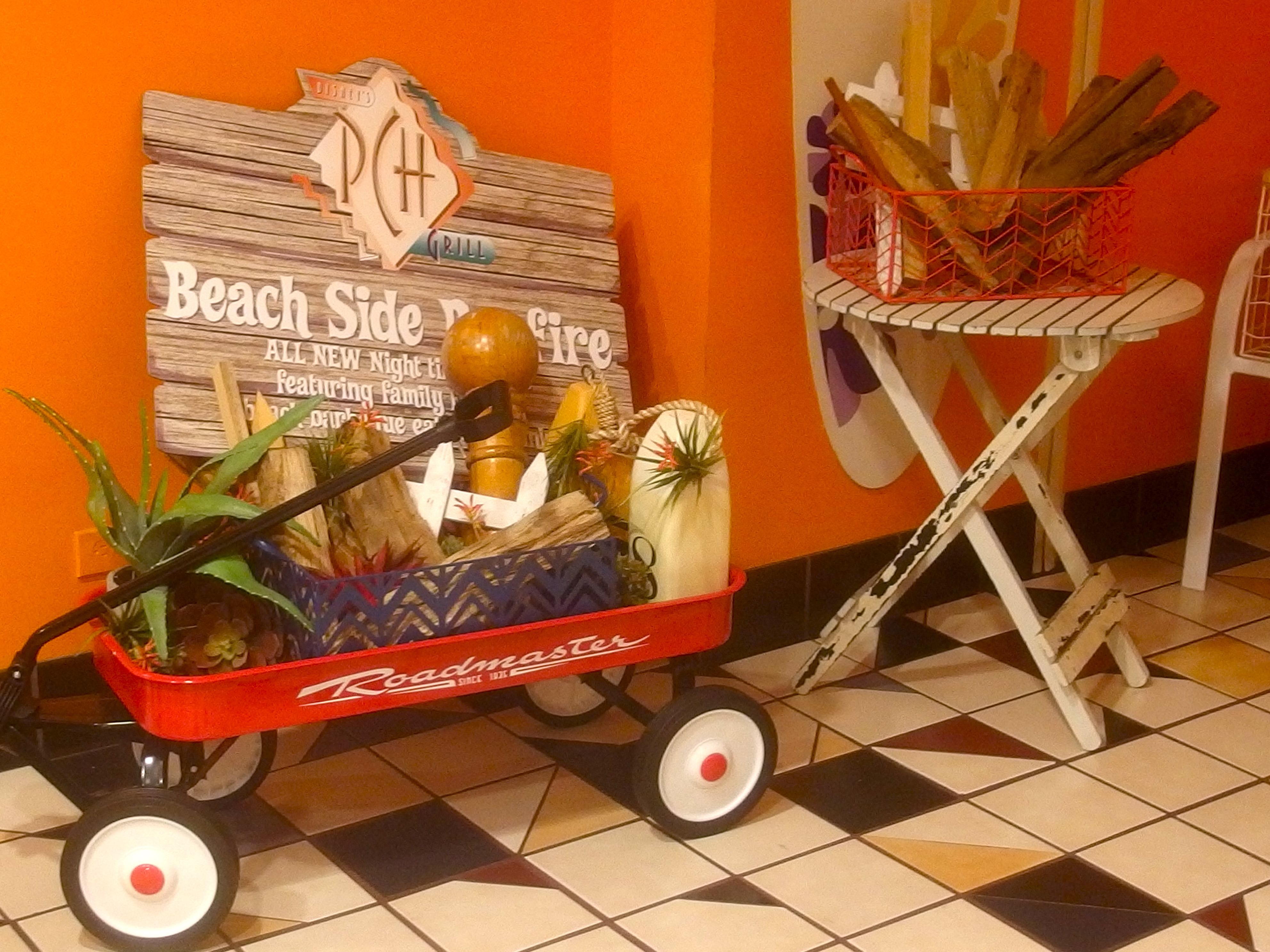 Offered in the Paradise Pier Hotel at the PCH Grill, the Beach Bonfire Dinner Buffet is a completely new menu, inspired by the kind of food one would expect to enjoy around a roaring fire of driftwood and scrap lumber at any southern California beach. New decorations through the restaurant subtly reinforce the theme. (Be sure to keep an eye out for the bucket of lumber that has the remnants of one of the PCH chairs!)