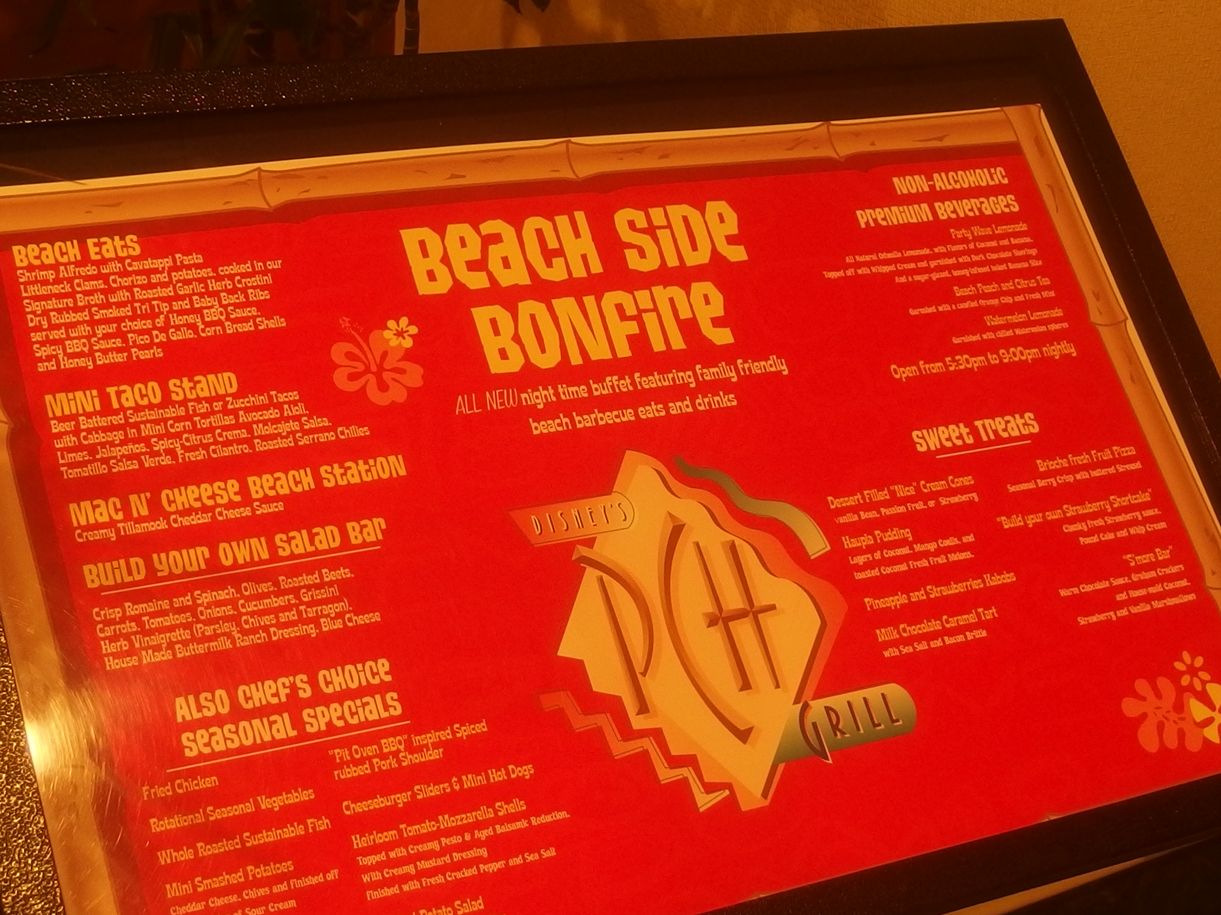 The Beach Bonfire Dinner Buffet is offered at the Paradise Pier Hotel and is open from 5:30 to 9:00pm nightly. Reservations are available at (714) 781-DINE (3463) between 7:00 AM and 9:00 PM daily (Pacific Time), or book on line.