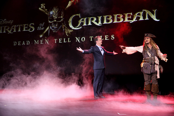 When speaking of Pirates of the Caribbean: Dead Men Tell No Tales, the stage began to fill with smoke as Sean Bailey announced that Will Turner (Orlando Bloom) would return for this film and that Javier Bardem will play the villainous Captain Salazar. He then welcomed Captain Jack Sparrow to the stage and there he was, not much unlike at previous D23 Expos. Johnny Depp in full costume, gracing the stage completely in character. He walked around enjoying the thunderous applause and sharing his bushel of grapes with the audience by throwing them out towards them and yelling “Grape!” each time. He then confessed “I don’t even like grapes.” Filming recently wrapped in Australia and Sean Bailey and Jack Sparrow waived goodbye as they disappeared behind the curtain.