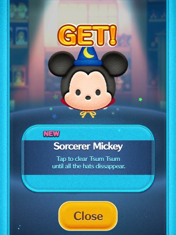 As a level one Tsum Tsum, unleashing Sorcerer Mickey's power allows you to tap the screen until his hats run out. He starts with just three hats, but I imagine the number of hats increase as he levels up. Unlike Donald Duck, when you tap as Sorcerer Mickey it treats it like popping a bubble, taking down all of the Tsum Tsums surrounding where you tap. And while his power is activated, the music becomes "The Sorcerer's Apprentice." YAAAASSSSSSS!