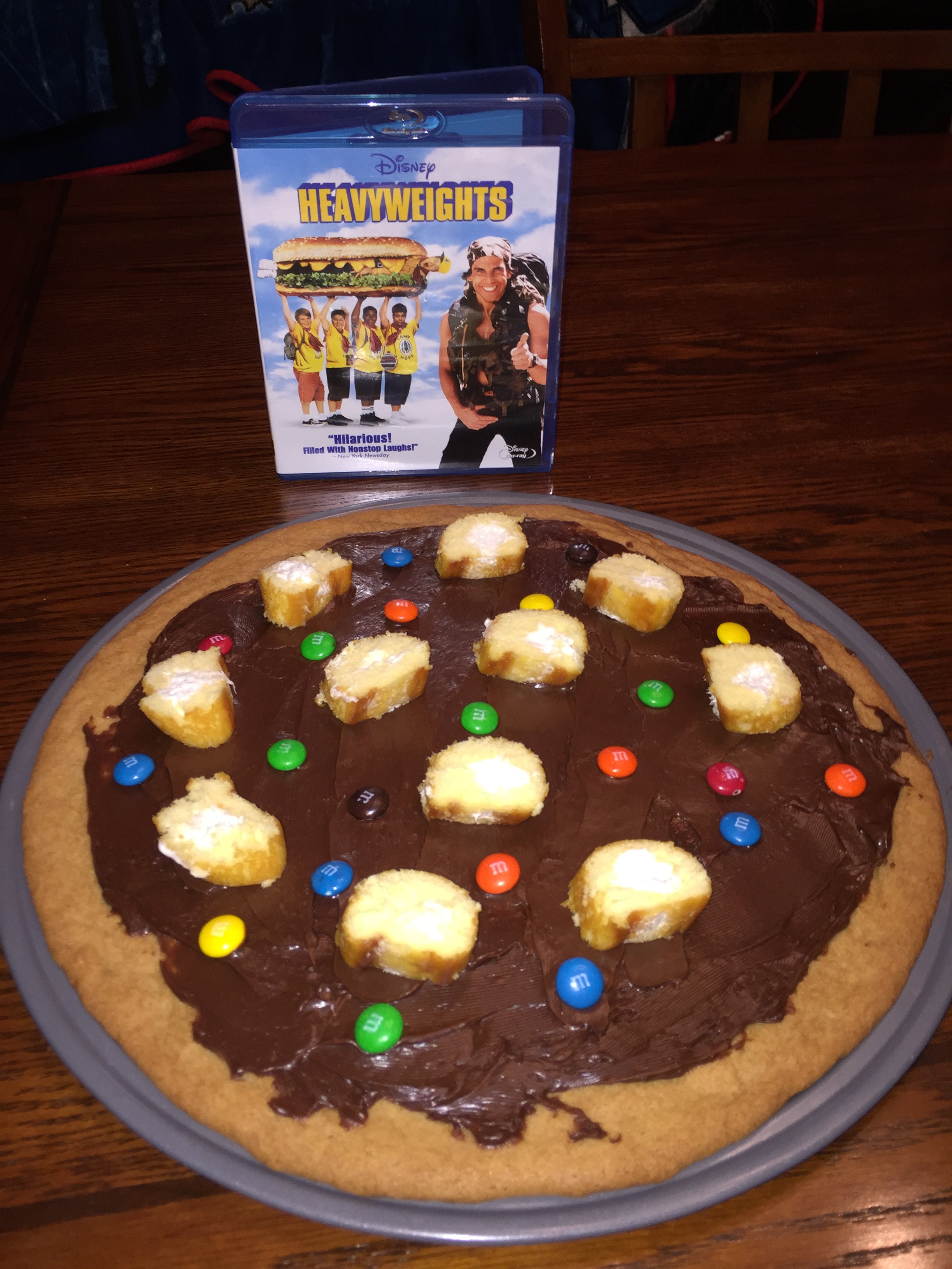“Don’t put Twinkies on your pizza!” That’s what Roy (Kenan Thompson) says when counselor Tim asks what the boys learned from their night of binge eating under the stars. And while the cream-filled treat would probably be extra gross on a traditional pizza, they are delicious on a dessert pizza. The cookie base comes from a Betty Crocker recipe. Add your favorite frosting, some candy, a few Twinkies and dessert is done! This dessert takes about an hour to make. Makes 8 slices.