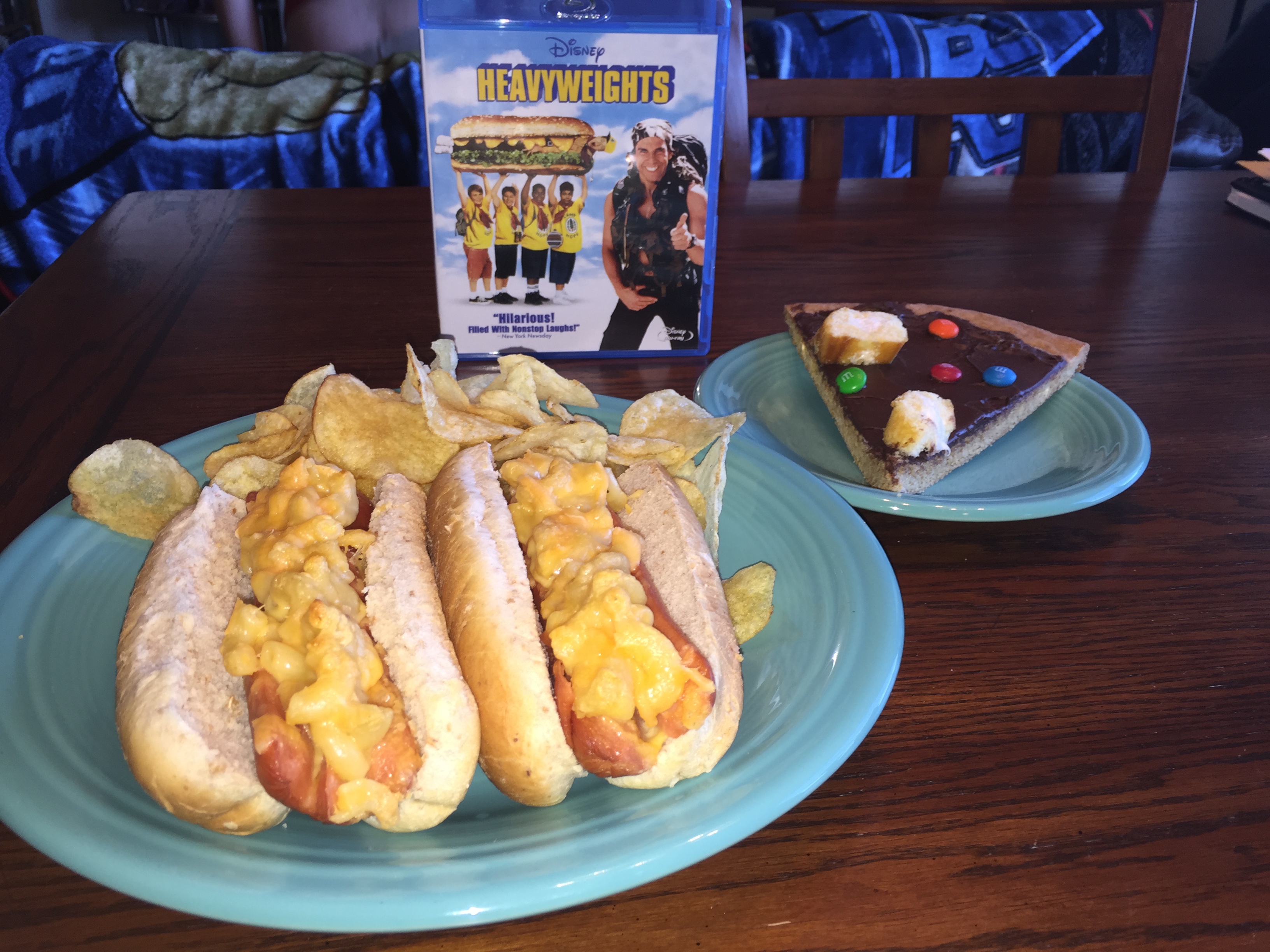 My first encounter with mac & cheese on a hot dog was at Walt Disney World, where you can obtain one at two separate theme parks (Hollywood Studios and Animal Kingdom). My first thought was “That’s the fattest thing I’ve ever seen.” Then I tried one and upon the first bite, I decided this would be a good way to die. So when it came time to finding the perfect main course for Heavyweights, which features a human hot dog on the poster, it seemed like the perfect choice. Pairs great with your favorite contraband potato chips. The total process takes about an hour. Makes 8 hot dogs. Based on a recipe from Food.com.