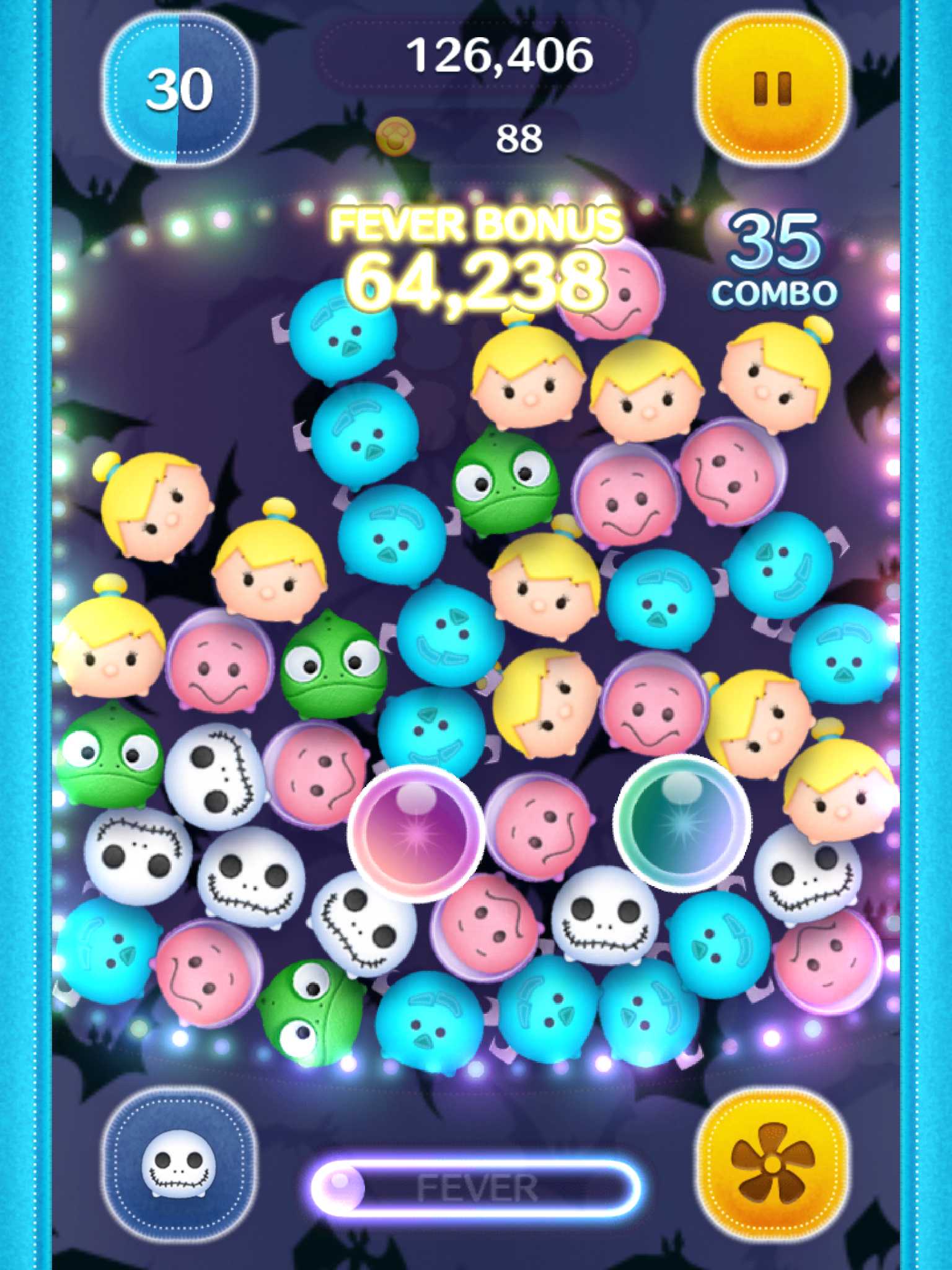 Since the TNBC Tsum Tsum set is here now, I've been playing with Jack and Zero more than usual. I had forgotten how great both are. With Jack, you can clear chains of Tsum Tums with a single tap and while his power is activated, the background looks sort of like The Haunted Mansion. Zero, on the other hand, zeroes out all of the Zero Tsum Tsums still on the screen. I like to save up his power until there's a lot of him to get a higher score.
