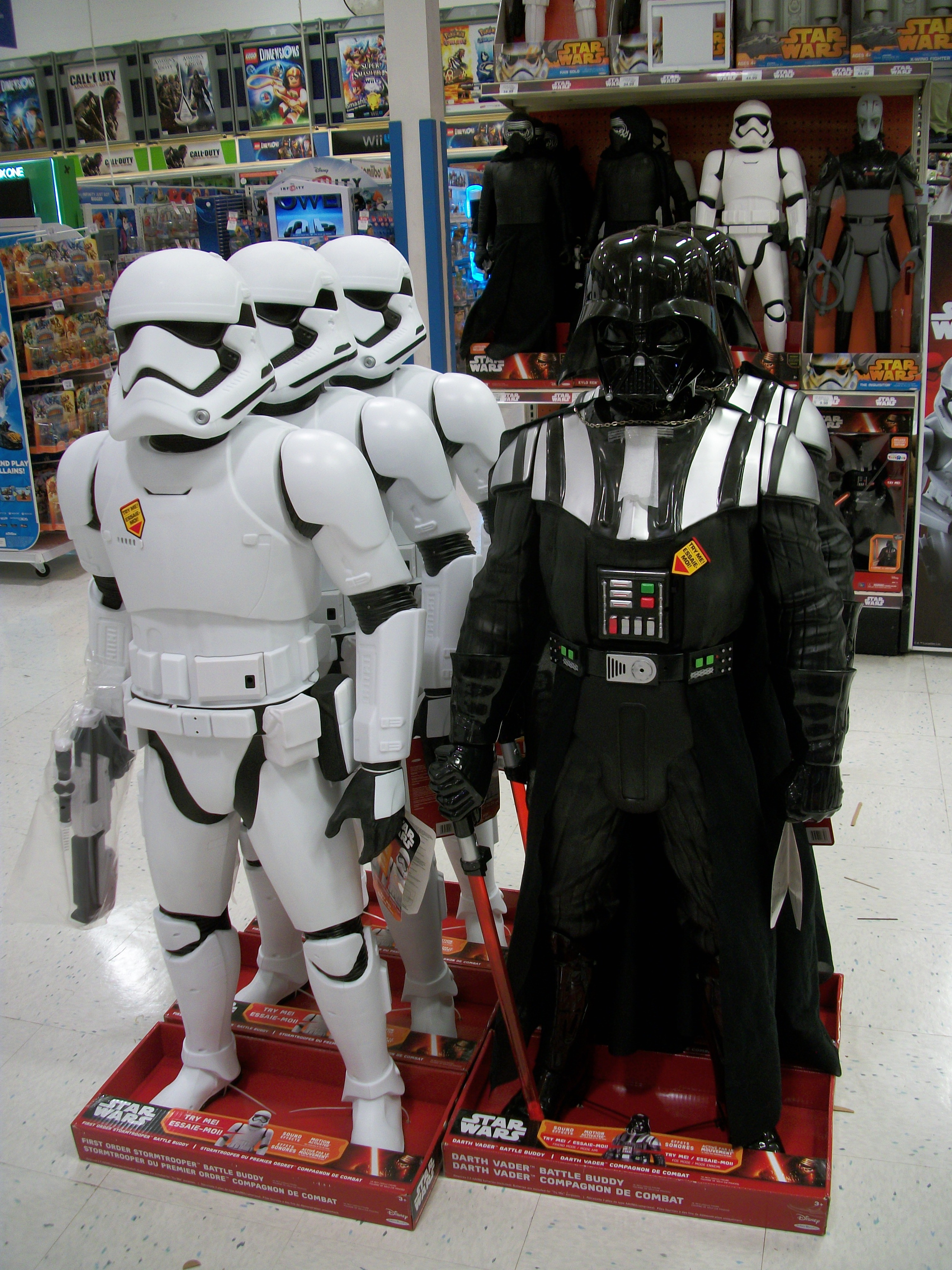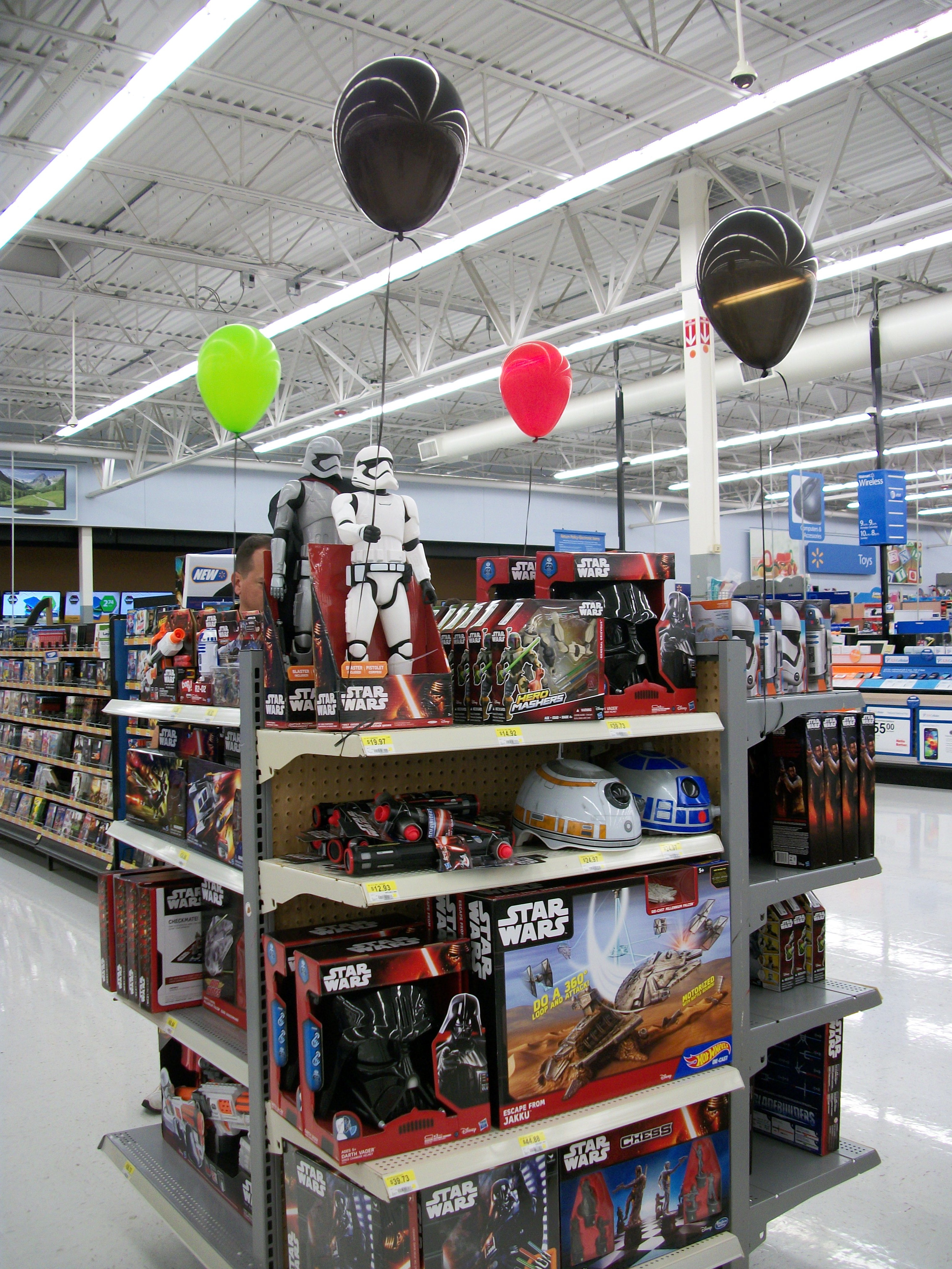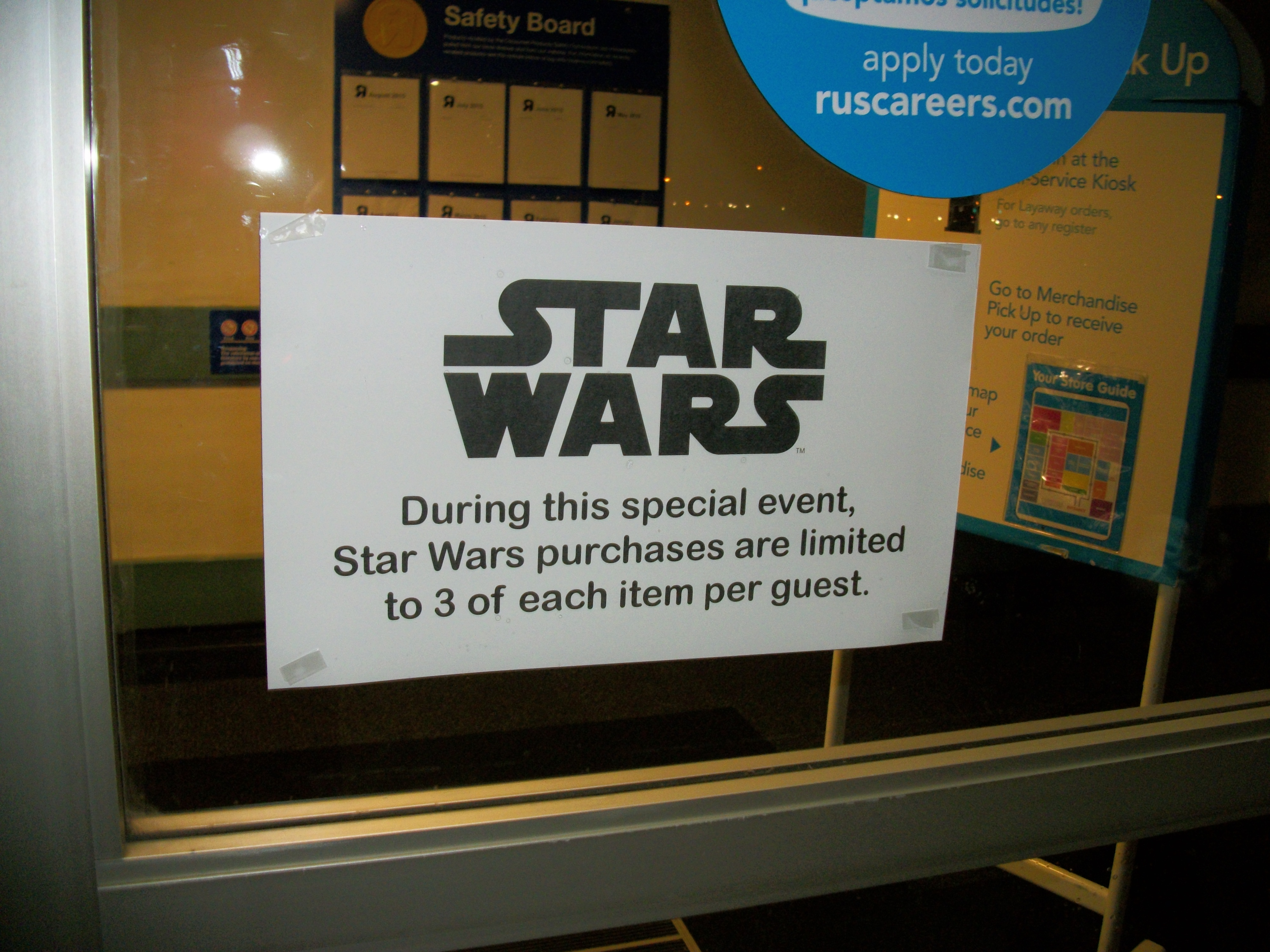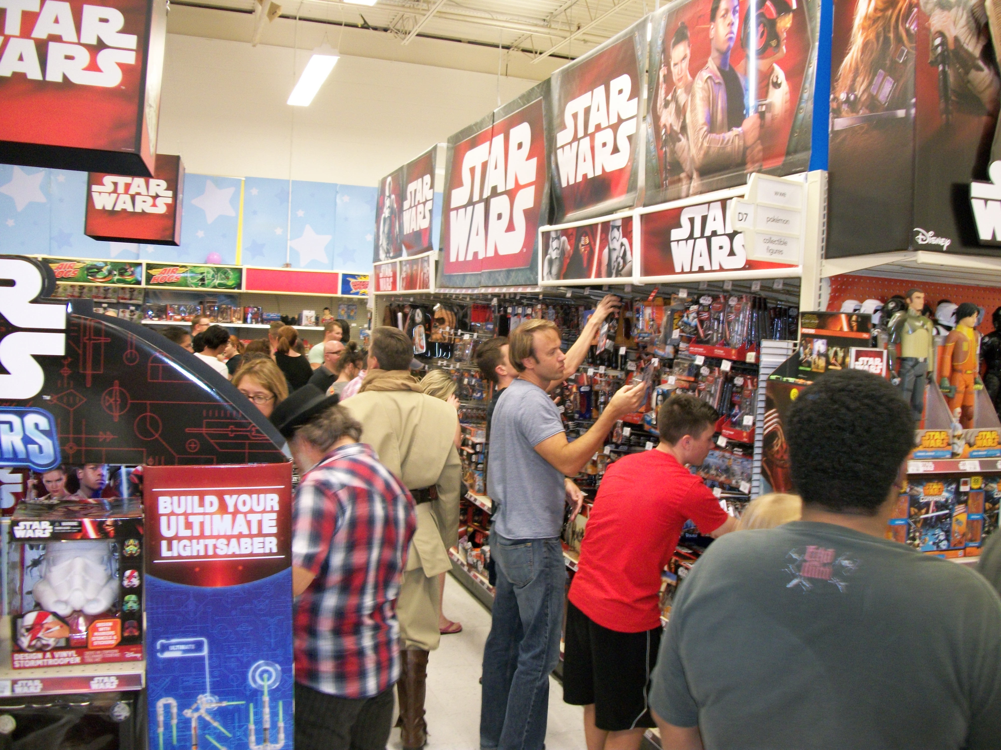 For myself and many other fans, the sign that there's a new Star Wars film around the corner is the release of the toys. Beginning with Episode One, the toy release has always been a midnight event, and the Episode Seven toys are no different. I decided to check out the three big stores doing midnight releases in my area: Toys R Us, Target, and Wal-Mart. I arrived at my local Toys R Us around 11 O'Clock to find that a line had formed outside of the building. Keeping the crowd entertained, and of course posing for photos was my Star Wars club JediOKC...