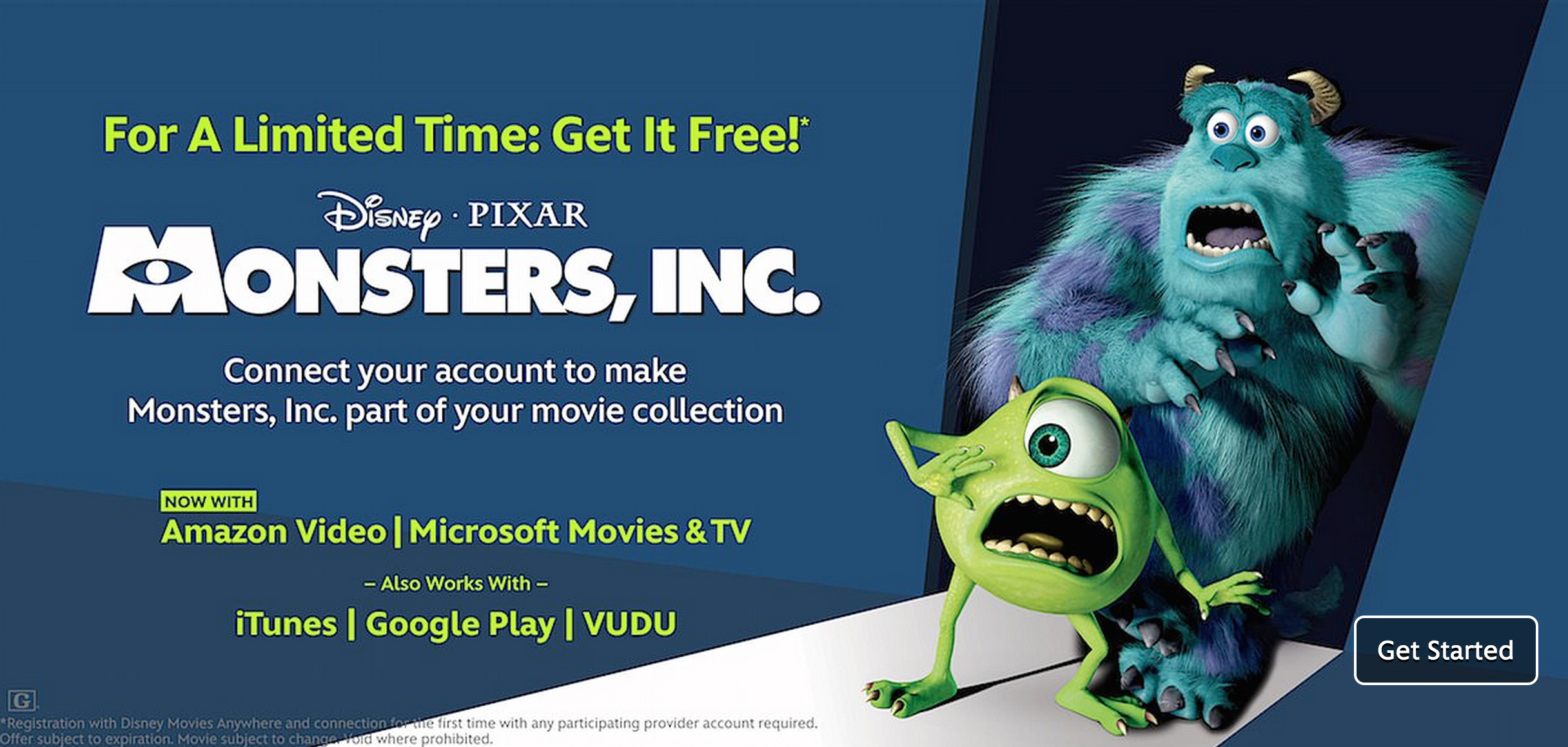 To encourage users to sign up and connect their accounts, Disney Movies Anywhere has always offered a limited time window to get a movie for free. When it went live with iTunes, The Incredibles was your bonus gift. Vudu and Google gave you a copy of Wreck-It Ralph. Current and new users who link Amazon and/or Microsoft get the bonus gift of Monsters, Inc. These films are 100% free, there's no obligation to buy anything. I've purchased a handful of Disney movies digitally, but more than 90% of my digital Disney movies came as digital copies with a DVD or Blu-Ray release.
