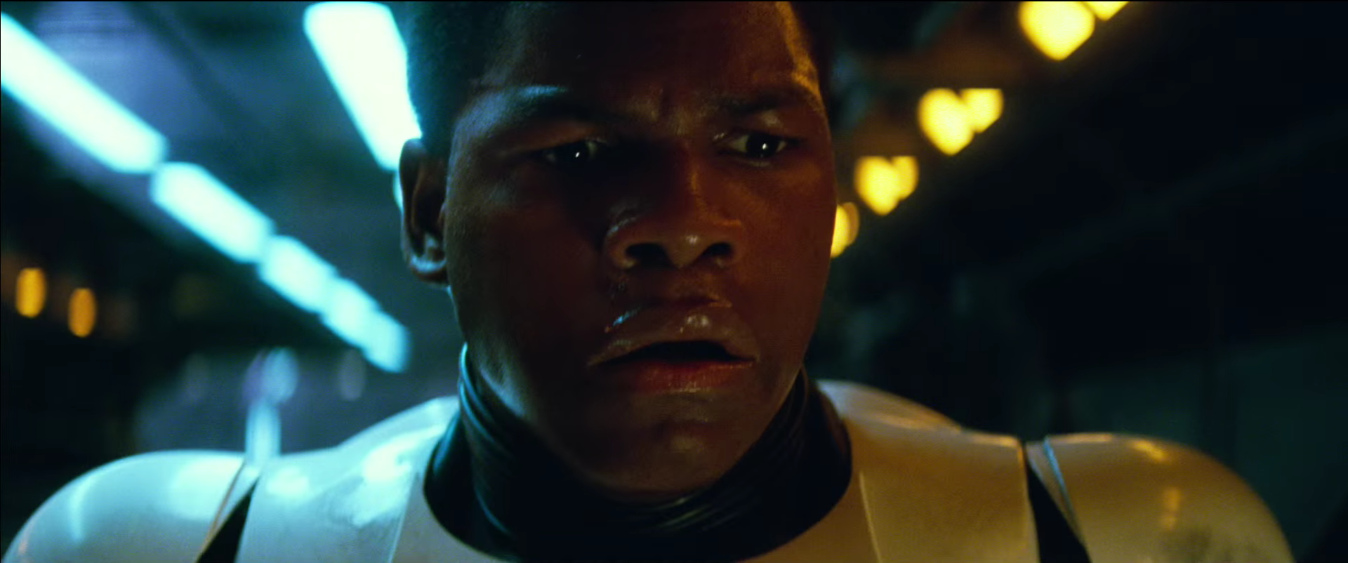 At this point, there are some shots of the Millennium Falcon being chased by Tie Fighters, and the music caught my attention. There is a newly orchestrated version of Han and Leia's love theme playing during this portion of the trailer, followed by Han Solo speaking with Finn and Rey. She states that "There are stories about what happened." Han replies that "It's true...all of it." We can assume they're discussing the events of Return of the Jedi, and the fall of the Empire...but we really can't be sure. This is followed by Han saying "the Dark Side..." accompanied by shots of Kylo Ren and Stormtroopers, and then as he says "...the Jedi." we get a front and center shot of Finn. A hint? Perhaps. We know he has Luke's Lightsaber from The Empire Strikes Back, which also happens to be Anakin's Saber...more on that shortly. At this point it's a fast-paced montage of clips, we finally get a quick look at Leia in Han's arms, and Finn firing up Luke's Saber to take on Kylo Ren. If you're paying attention here, you'll notice that Ren's hood and mask are removed. You had to figure that this was going to happen at some point anyway. I mean, why hire Adam Driver to play the character if you're not going to show his face?