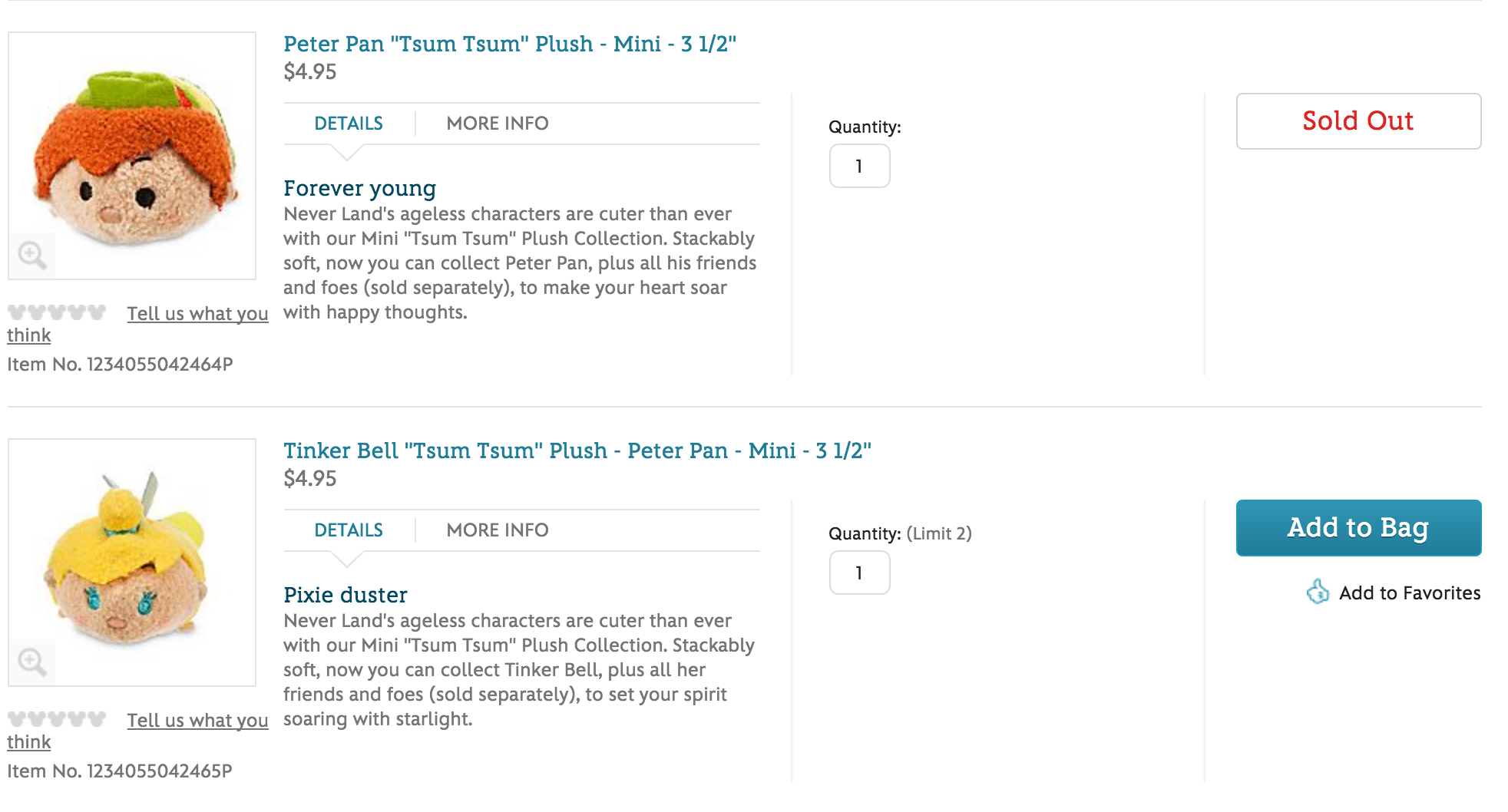 My favorite Walt-era Disney animated film is Peter Pan, so you bettah believe that I woke up at midnight to wait and wait and wait for disneystore.com to put them up. After 15 frantic minutes of refreshing the site, clearing my cache, checking twitter and repeating the process at warp speed, I finally had my chance at 'em. I clicked "Add to Cart" in record time on all 10 and quickly checked out. I'm glad I woke up early because when I checked to see what was left in the morning, it was just Tinker Bell. And it wasn't long before she was gone too. Disney still doesn't understand that they could make more money if they made enough T$um T$um$ to meet demand. $tupid Di$ney...My set shipped yesterday and I hope to have them next week for my Tsum Tsum Life vlog.
