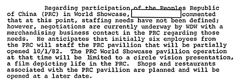 Although the Soviets never joined EPCOT, another communist nation did: The Peoples Republic of China. The documents show that the Burea was especially interested in the Cast Members who would be working at China pavilion. (Note the use of the term "circle vision" in the middle of a paragraph discussing how many Chinese employees would be staffing the pavilion):