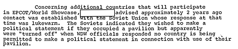 A couple of years before the park opened, the Soviet Union was apparently in talks to join World Showcase. FBI documents suggest that part of the reason this never happened was because the Union was informed they wouldn't be allowed to use their pavilion to make political statements.