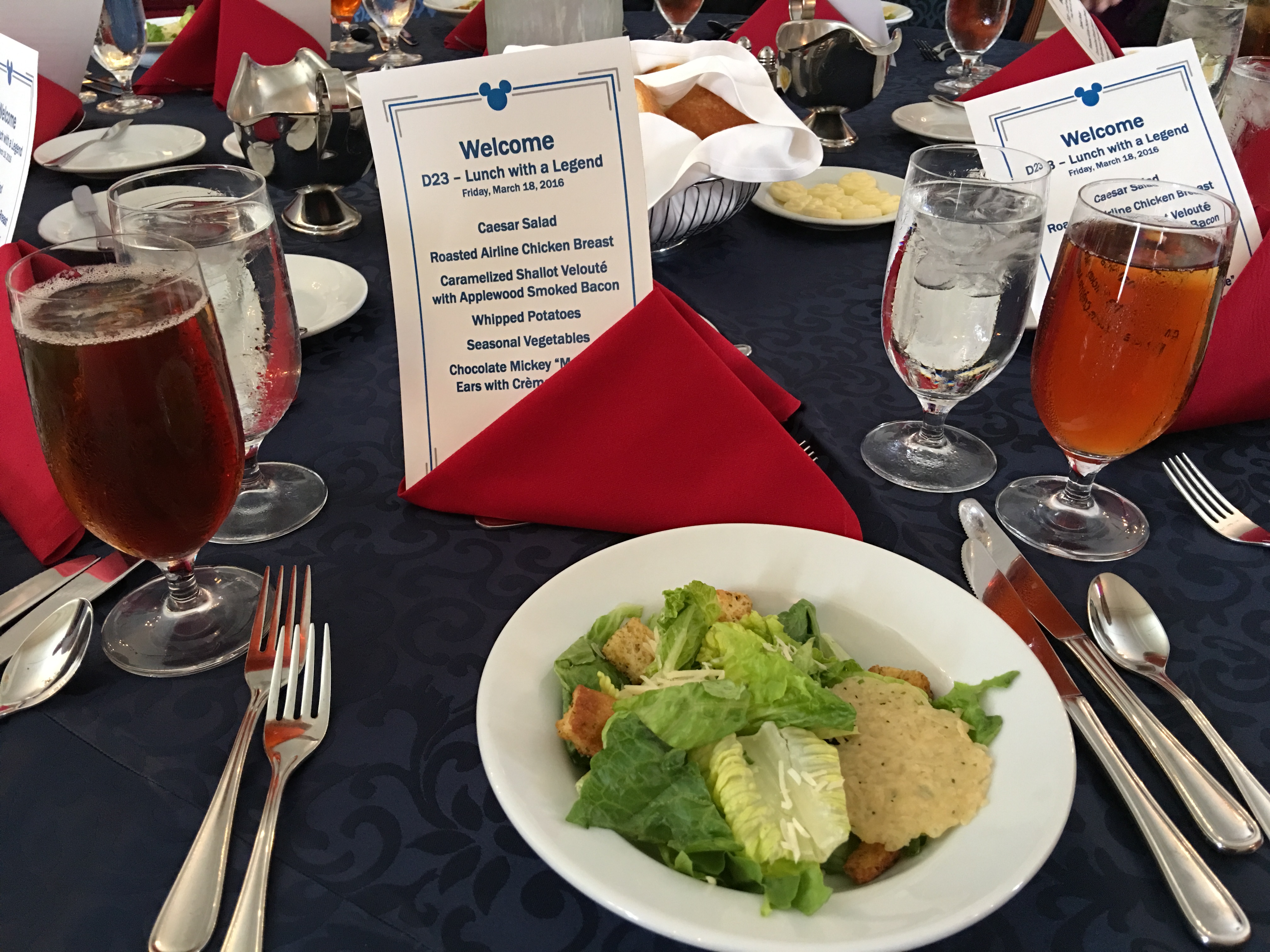 Ridgway was joined by 2015–16 Walt Disney World Ambassadors Caitlin Busscher and Nathaniel Palma and proceeded to talk about his history with the company and some of his achievements before taking a few questions from the 40 of us gathered in the American Adventure Parlor at Epcot. One of my favorite moments was when Busscher and Palma, who both had cards with talking points or questions for Ridgway, looked at each other and put the cards under their seats because he never needed any help with topics to speak on. By far the most amazing piece of information that was shared with us was when Ridgway was talking about July 17, 1955. Among the mayhem of the live broadcast we have all seen countless number of times, it wasn't a story of ladies heels getting caught on Main St. but about how, after the broadcast, everyone left and he called his wife back to the park and was able to enjoy the park virtually empty on opening day! After 45 minutes of so of Ridgway entertaining us, we were moved into the main room for lunch.