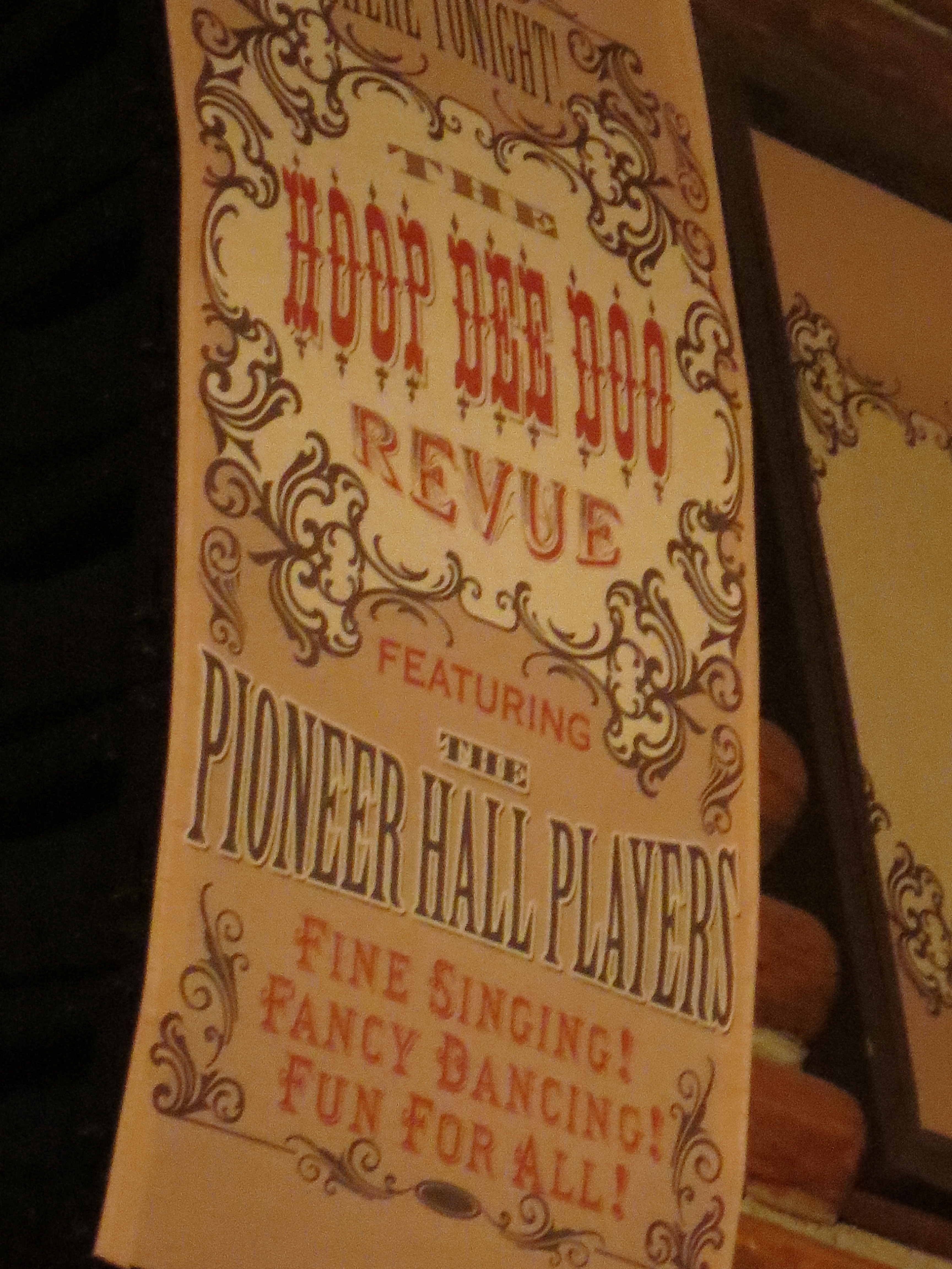 Located at Fort Wilderness Campground (on the south shore of Bay Lake and southeast of the Magic Kingdom), Pioneer Hall is designed to bring to mind the old American Frontier dance halls of the west. In this 362-seat theater, vacationers have flocked for over 40 years to see the comical, foot stomping Hoop Dee Doo Musical Revue. Considered one of the longest continuously running musicals in American theater, Hoop Dee Doo Musical Revue (and dinner) has been seen by more than 10 million park guests and it owes its existence to the hall it is housed in.