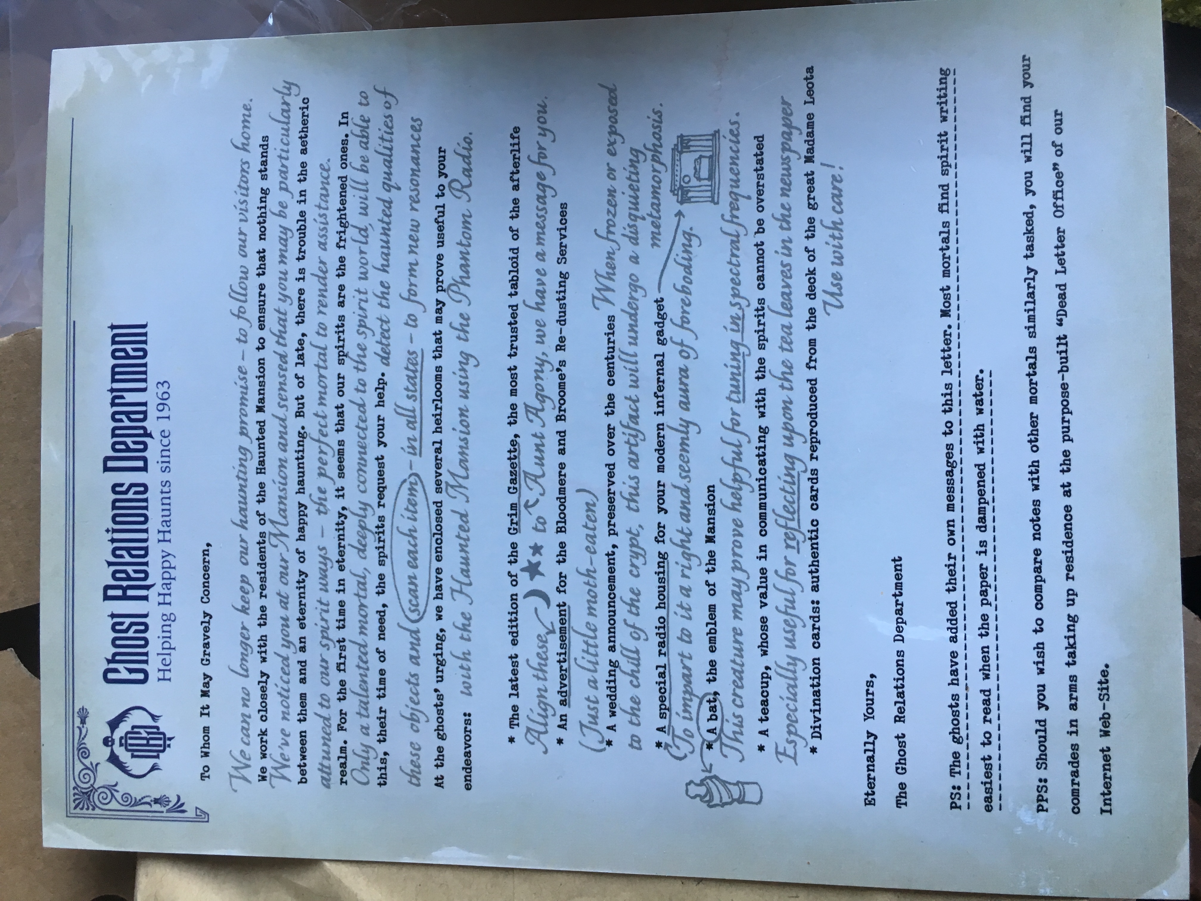 Today we got our first Ghost Post parcel. Inside were several items that, when combined with the Phantom Radio app, give us part of a mystery to what is happening inside the Haunted Mansion. In case you aren't one of the 999 happy haunts participants, here's all the fun that this first shipment contained: