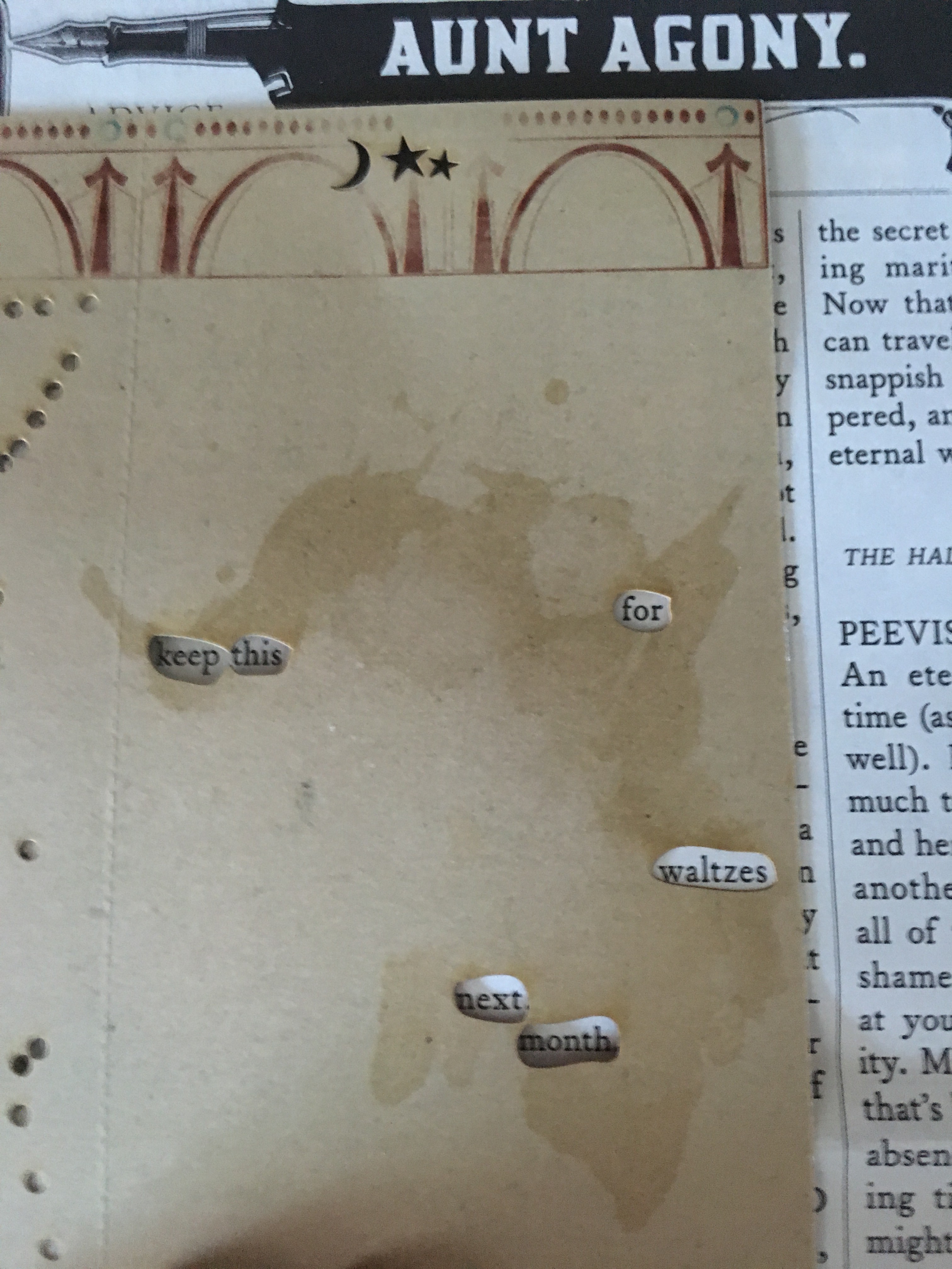 If you take the ad and turn it upside down you will see a moon and two stars on top. When aligned with the same symbol in the Aunt Agony column in The Grim Gazette, you see a secret message through the "moth holes." The message "keep this for waltzes next month" implies that this piece will be reused in the future.