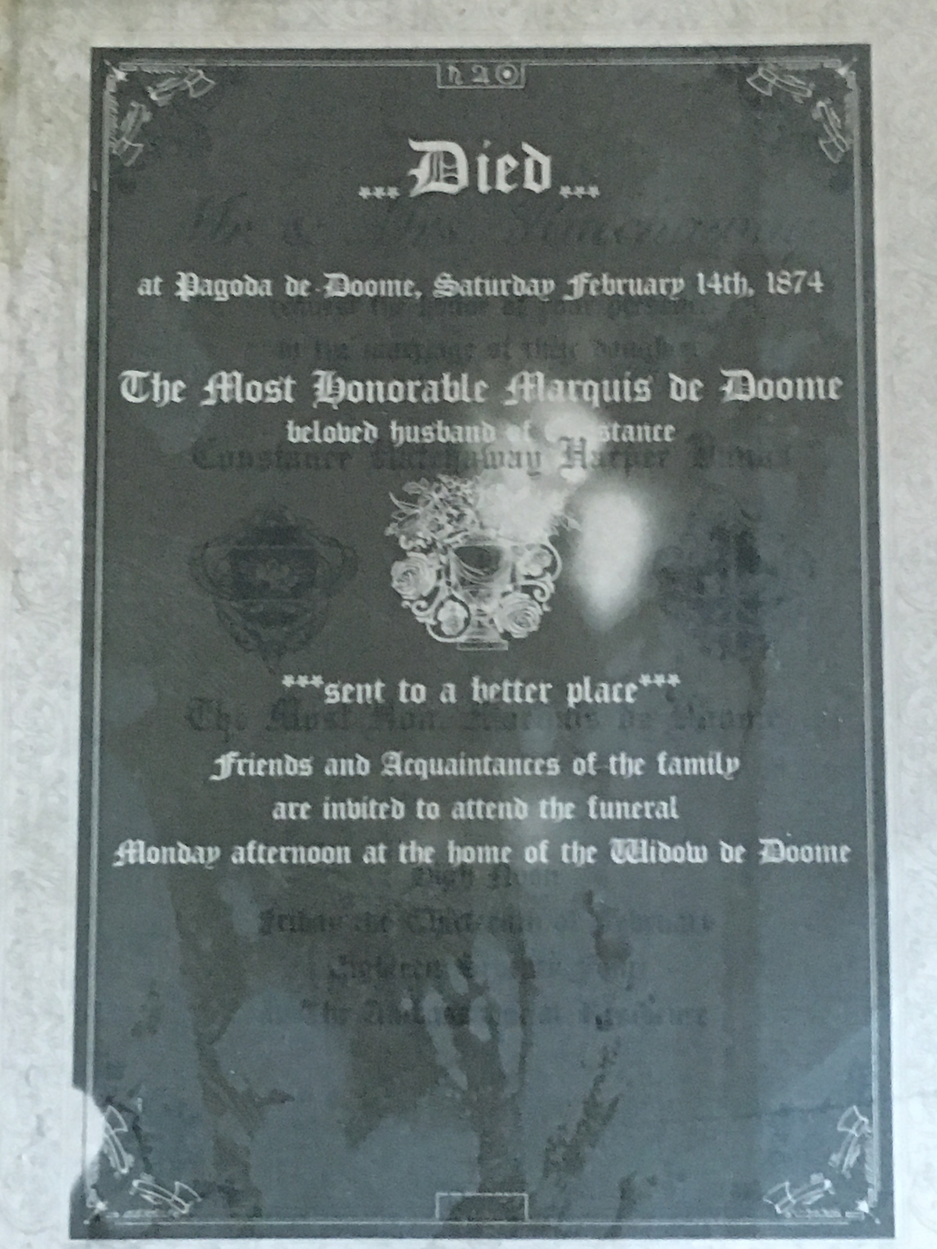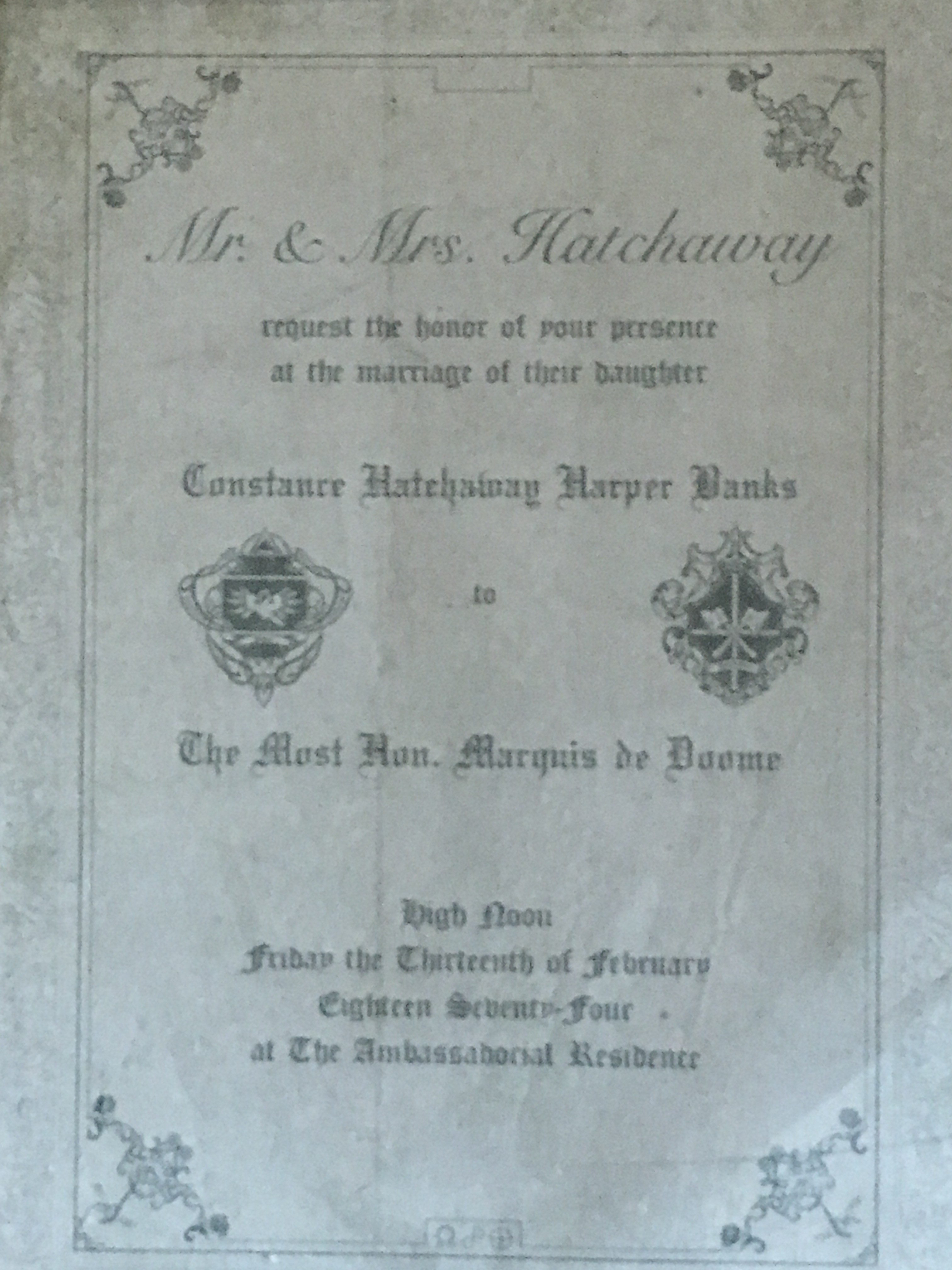 Next, we have a wedding announcement for the nuptials of Constance Hatchaway Harper Banks and The Most Honorable Marquis de Doome from 1874. When this item is scanned, we hear: