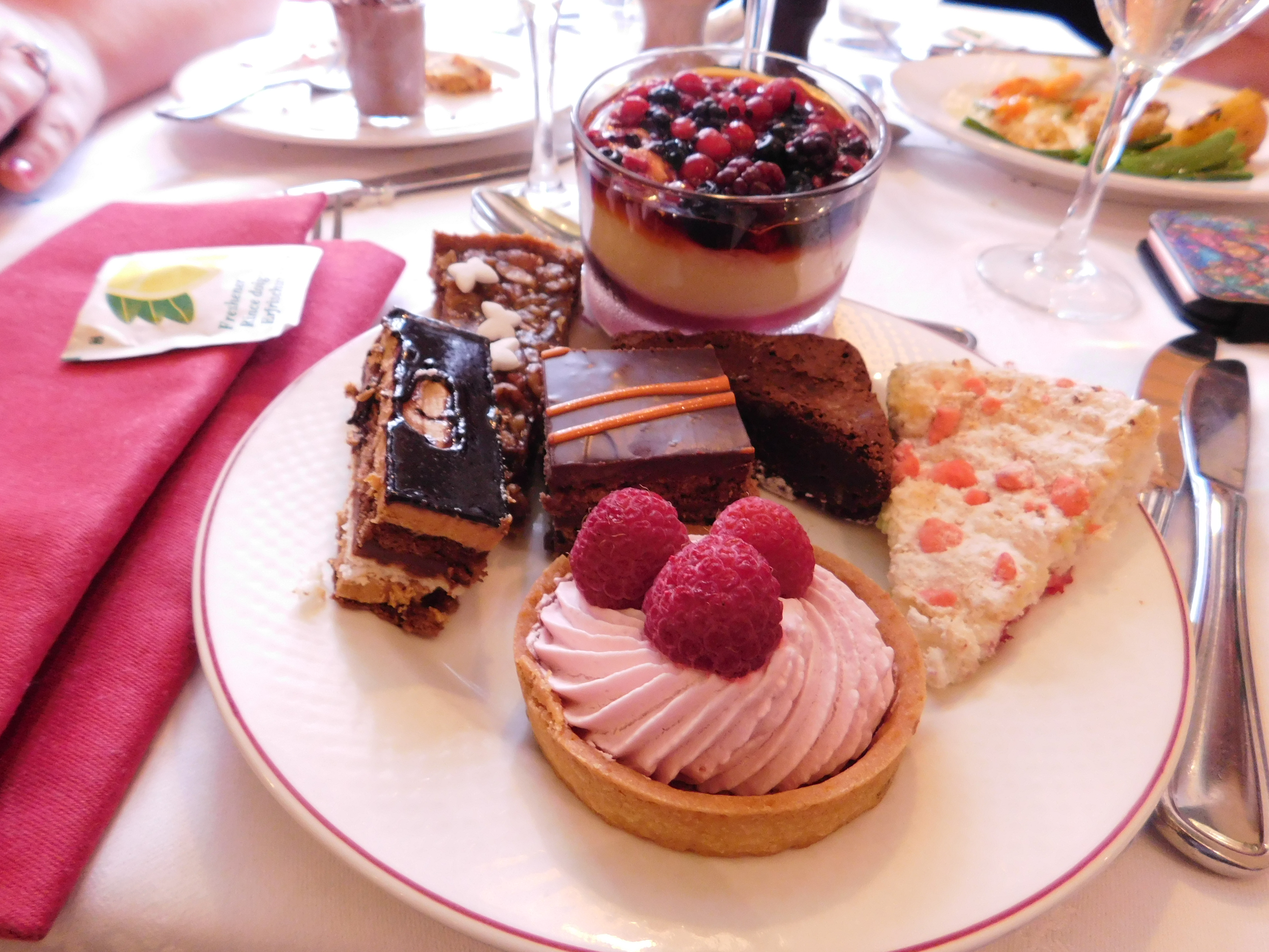 A wide variety of brownies and cakes including a delicious strawberry cheesecake. There were also berry tarts, yogurt cups, madeleines, raspberry and blueberry crème cake, pots de crème, chocolate eclairs, French doughnuts with assorted sauces, and wrapped candies and lollipops.