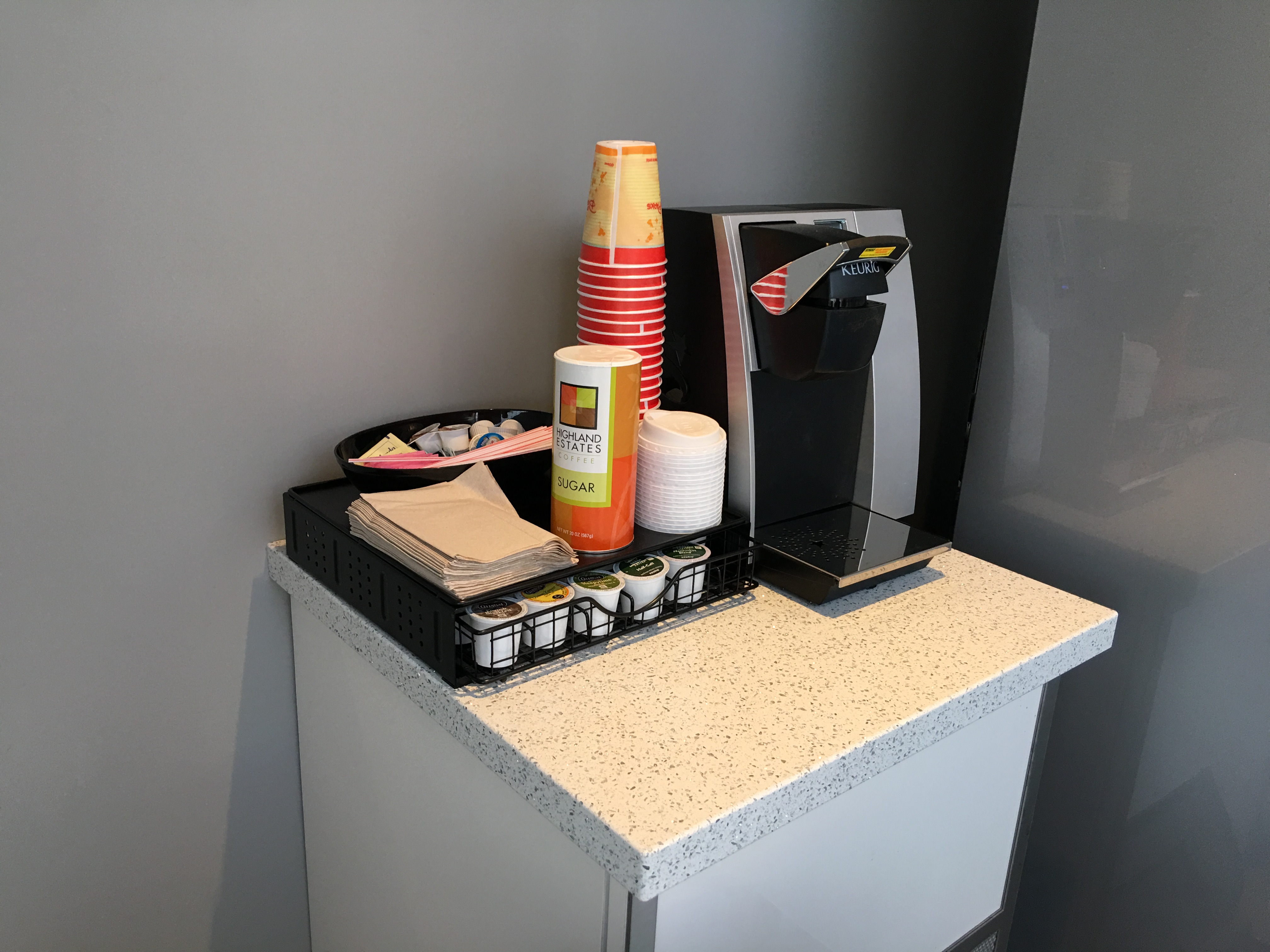 My favorite benefit that the lounge has to offer would be the Coke Freestyle machines where guests can enjoy one of over 100 Coke products. But, if on one of those rare days you need something to help warm your bones, there is also a Keurig machine with a few options of K-Cups.